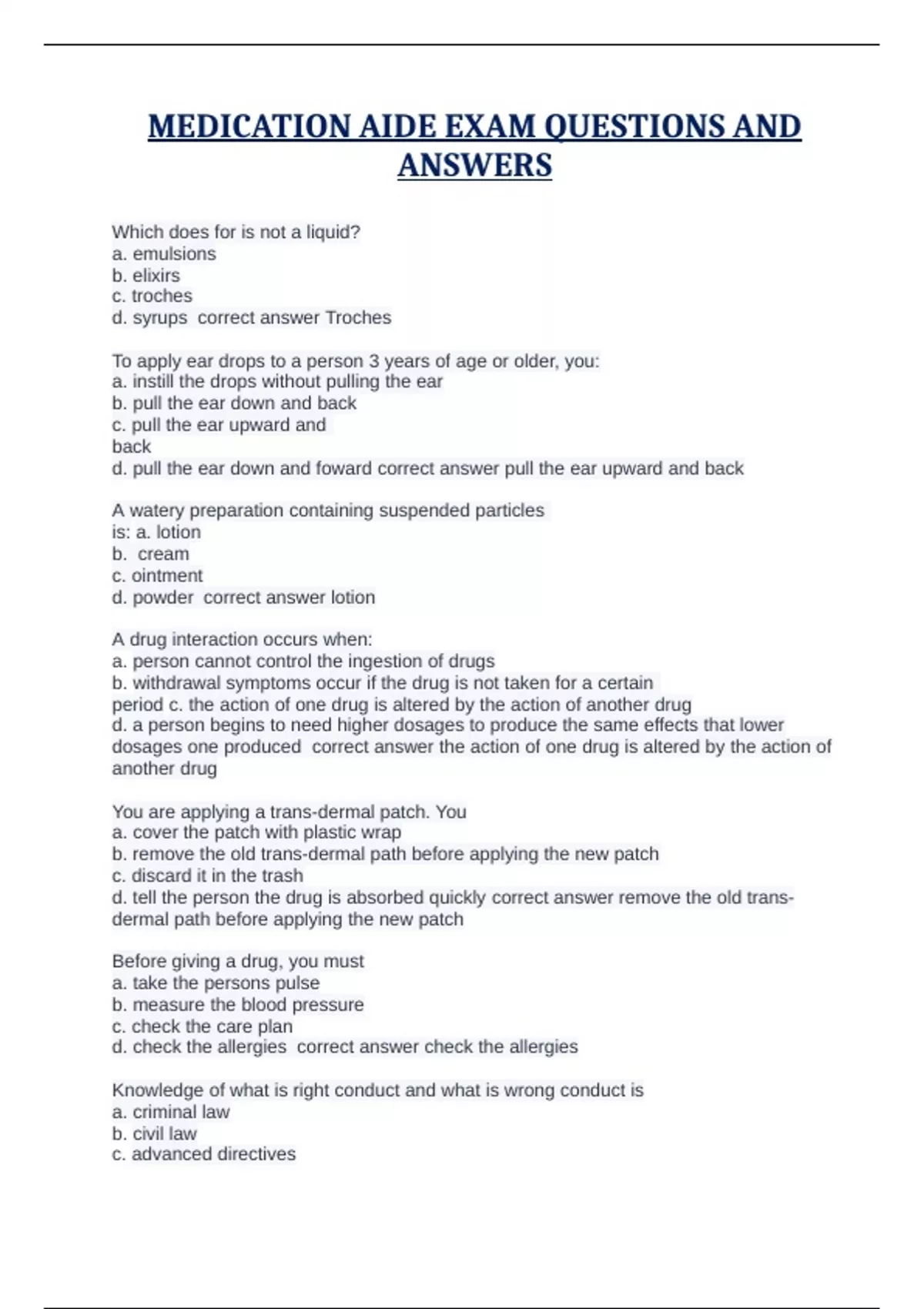 Medication Aide TEST Questions and Answers (2023/2024) (Verified Answers)