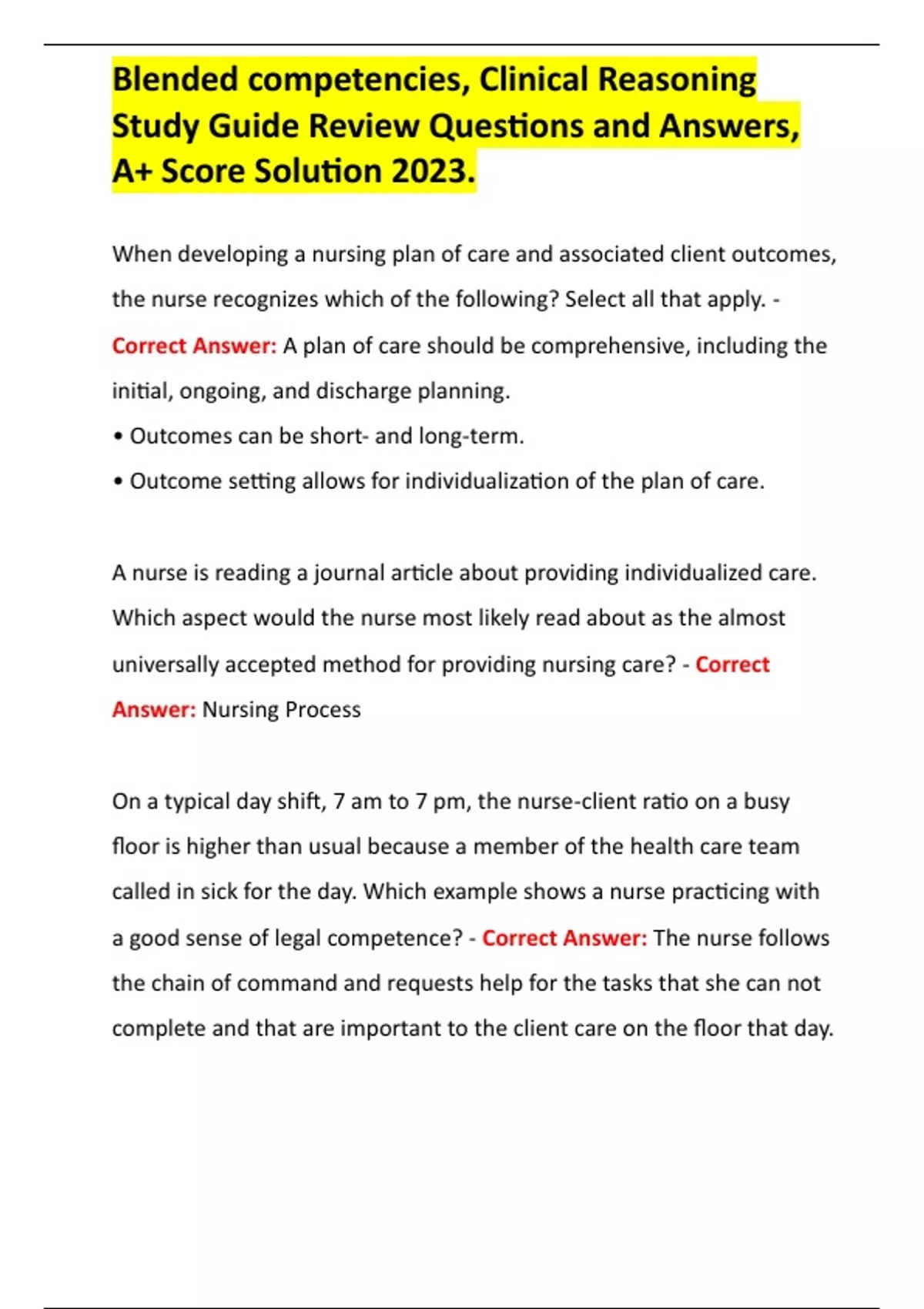 Blended competencies, Clinical Reasoning Study Guide Review Questions and Answers, A+ Score Solution 2023.