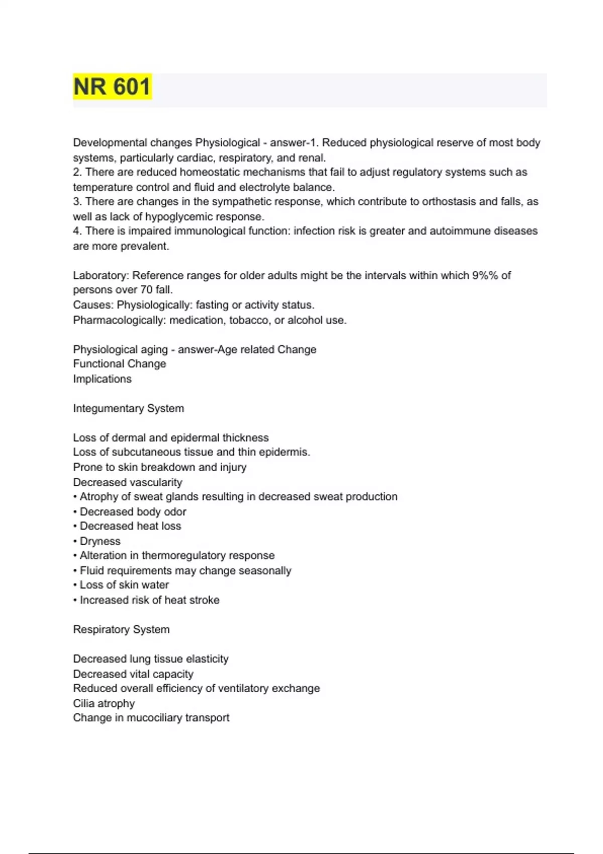 NR 601 2023 exam A+ graded 100% verified correct answers with full solution Developmental changes Physiological - answer-1. Reduced physiological reserve of most body systems, particularly cardiac, respiratory, and renal. 2. There are reduced homeostatic mechanisms that fail to adjust regulatory systems such as temperature control and fluid and electrolyte balance. 3. There are changes in the sympathetic response, which contribute to orthostasis and falls, as well as lack of hypoglycemic response. 4. There is impaired immunological function: infection risk is greater and autoimmune diseases are more prevalent. Laboratory: Reference ranges for older adults might be the intervals within which 9%% of persons over 70 fall. Causes: Physiologically: fasting or activity status.