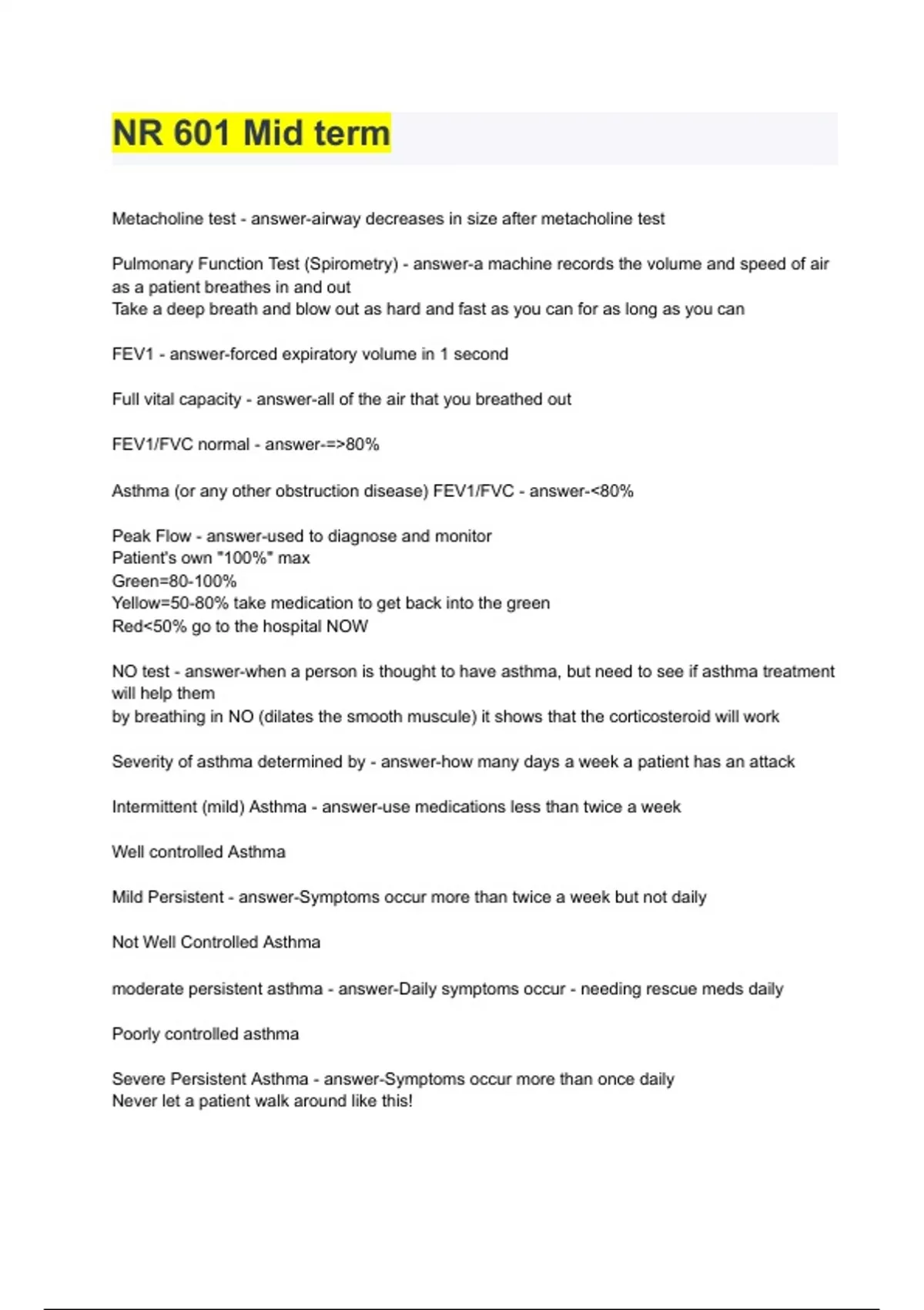 NR 601 Mid term 2023 100% correct answers /A+ graded Metacholine test - answer-airway decreases in size after metacholine test Pulmonary Function Test (Spirometry) - answer-a machine records the volume and speed of air as a patient breathes in and out Take a deep breath and blow out as hard and fast as you can for as long as you can FEV1 - answer-forced expiratory volume in 1 second Full vital capacity - answer-all of the air that you breathed out FEV1/FVC normal - answer-=>80%