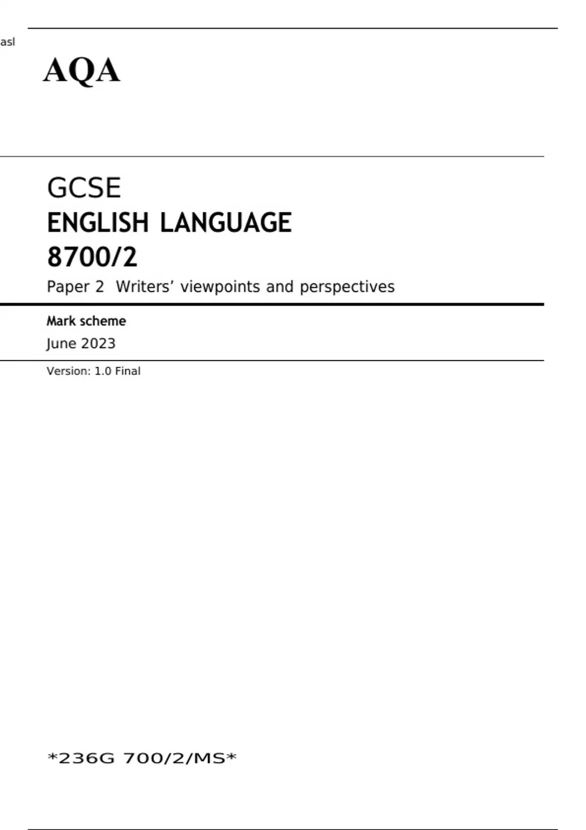 AQA GCSE ENGLISH LANGUAGE Paper 2 JUNE 2023 MARK SCHEME: Writers’ viewpoints and perspectives