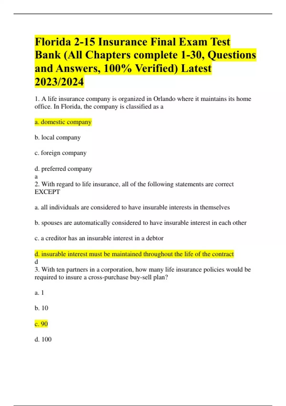 Florida 2-15 Insurance Final Exam Test Bank (All Chapters complete 1-30, Questions and Answers, 100% Verified) Latest 2023/2024 Florida 2-15 Insurance Final Exam Test Bank (All Chapters complete 1-30, Questions and Answers, 100% Verified) Latest 2023/2024 1. A life insurance company is organized in Orlando where it maintains its home office. In Florida, the company is classified as a a. domestic company b. local company c. foreign company d. preferred company a 2. With regard to life insurance, all of the following statements are correct EXCEPT a. all individuals are considered to have insurable interests in themselves b. spouses are automatically considered to have insurable interest in each other c. a creditor has an insurable interest in a debtor d. insurable interest must be maintained throughout the life of the contract d 3. With ten partners in a corporation, how many life insurance policies would be required to insure a cross-purchase buy-sell plan? a. 1 b. 10 c. 90 d. 100 c 4. All of the following statements about variable annuities are correct EXCEPT a. Variable products are regulated by the SEC and the Office of Insurance Regulation. b. The consumer directs the investments of the product. c. An annuitized variable annuity will provide a level income amount to the annuitant for life. d. Variable annuities are sold by insurance companies. c 5. All of the following statements regarding policy replacement are correct EXCEPT a. replacement involves convincing a policyholder to lapse or terminate an existing policy and to purchase another b. interrupting one cash value insurance plan to begin another could cause serious financial problems for the policy owner c. even if the customer wants to replace his or her existing policy, an agent can effect a policy replacement only by following the replacement regulations in his or her state d. premiums for replacement policies are generally lower than premiums for the existing policy they replace d 6. How are accumulation unit gains taxed? a. Gains in accumulation units are taxed as ordinary income. b. Gains in accumulation units are taxed as capital gains. c. Gains in accumulation units are taxed using the exclusion ratio. d. Gains in accumulation units are not taxed d 7. After a family's breadwinner dies, the "blackout period" generally can be defined as the period a. during which children are living at home b. that begins with the youngest child turns 16 and ends with the surviving parent retires c. during which children are in school d. from the surviving parent's retirement to death b 8. All of the following approaches are used by insurers to determine benefits payable under basic surgical expense insurance EXCEPT a. relative value scale approach b. traditional net cost method c. reasonable and customary approach d. surgical schedule method b 9. When may a health insurance company change the wording of a uniform policy provision? a. It may only be changed if approved by the Office of Insurance Regulation. b. It may only be changed if the new wording is not less favorable to the insurer. c. It may only be changed if the new wording is not less favorable to the insured. d. It may only be changed if the new wording is more favorable to the insurer. c 10. The surviving spouse may begin receiving retirement benefits as early as what age? a. 59 1/2 b. 60 c. 62 d. 65 b 11. Beth's health insurance policy contains a provision that allows her to renew coverage up to age 65. However, the policy also states that should Beth lose her job, the insurance company will cancel the policy, regardless of Beth's age. In terms of renewability, what type of policy does Beth have? a. Cancellable b. Optionally renewable c. Guaranteed renewable d. Conditionally renewable d 12. Which of the following constitutes an insurable interest? a. The policy owner must expect to benefit from the insured's death. b. The policy owner must expect to suffer a loss when the insured dies or becomes disabled. c. The beneficiary, by definition, has an insurable interest in the insured. d. The insured must have a personal or business relationship with the beneficiary. b 13. Which of the following is NOT included in the definition of "transacting insurance"? a. issuing an insurance policy b. accepting an insurance application c. underwriting a policy d. accepting a premium payment c Which of the following is CORRECT? a. Applicants cannot dispute their consumer reports. b. Applicants will be notified by the credit reporting agency that the application for life insurance has been rejected. c. If the applicant requests their credit report, the insurance company must provide a copy of one. d. Insurance companies have to notify applicants within a few days that a consumer report has been requested. d 15. All of the following are features of an equity indexed product EXCEPT: a. Equity index products are usually invested in the S&P 500. b. Equity index products allow the contract holder to direct the investments. c. Equity index products are primarily for accumulation. d. Equity index products guarantee a minimum interest rate. b 16. Regular notices sent to policy-owners for payment of their life insurance policy premiums reflect a. gross premium b. net level premium c. net single premium d. none of the above a 17. Which of the following is NOT true of term insurance? a. Cash values do not accumulate with term insurance. b. Coverage under term insurance is temporary. c. Cash values build during the specified period of temporary coverage. d. Benefits are payable if death occurs during a specific time period. c 18. The parole evidence rule says a. Oral evidence is accounted for before written evidence. b. Signed contracts cannot be changed. c. Written contracts cannot be changed by oral evidence. d. Oral contracts cannot be changed by written contracts. c 19. Leonard owns a major medical health policy which requires him to pay the first $200 of covered expenses each year before the policy pay