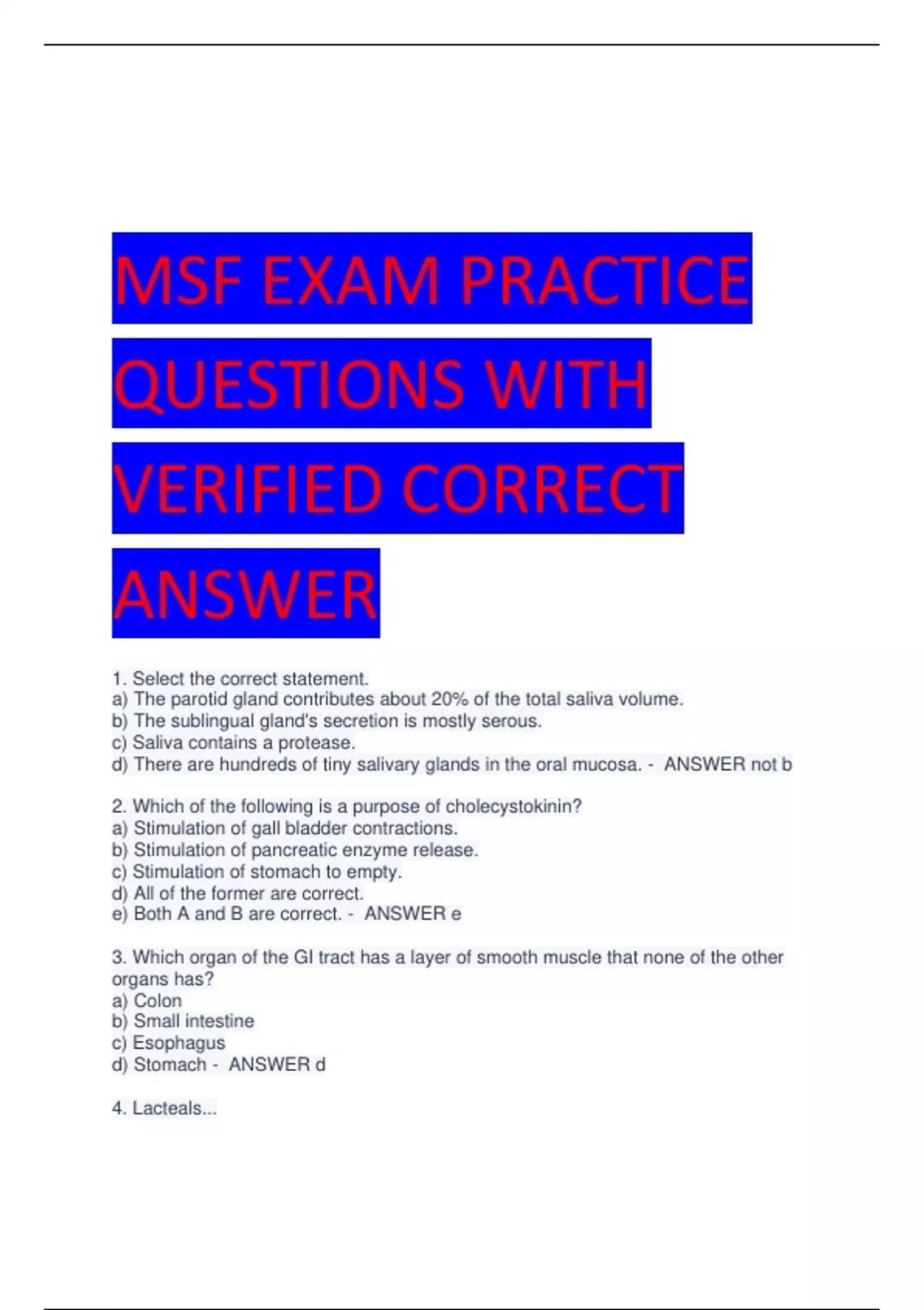MSF EXAM PRACTICE QUESTIONS WITH VERIFIED CORRECT ANSWER 1. Select the correct statement. a) The parotid gland contributes about 20% of the total saliva volume. b) The sublingual gland's secretion is mostly serous. c) Saliva contains a protease. d) There are hundreds of tiny salivary glands in the oral mucosa. - ANSWER not b 2. Which of the following is a purpose of cholecystokinin? a) Stimulation of gall bladder contractions. b) Stimulation of pancreatic enzyme release. c) Stimulation of stomach to empty. d) All of the former are correct. e) Both A and B are correct. - ANSWER e 3. Which organ of the GI tract has a layer of smooth muscle that none of the other organs has? a) Colon b) Small intestine c) Esophagus d) Stomach - ANSWER d 4. Lacteals... a) are found within each microvillus in the small intestine. b) are capillaries of the small intestine mucosa. c) absorb lipids and cholesterol into the lymph system. d) synthesize chylomicrons. - ANSWER c 5. Absence of a portion of the enteric nervous system in the small intestine could lead to... a) a gastrin-producing tumor and intestinal ulceration. b) intestinal ischemia. c) malabsorption due to improper digestion. d) intestinal obstruction and constipation. - ANSWER d 6. The interstitial cells of Cajal... a) periodically partially depolarize myenteric smooth muscle. b) periodically stimulate contractions of myenteric smooth muscle. c) periodically partially depolarize submucosal smooth muscle. d) periodically stimulate contractions of submucosal smooth muscle. - ANSWER a 7. Which of the following will increase the rate at which the stomach empties? a) Extreme distension. b) Rhythmic segmentation in the duodenum. c) Orad region is not very full. d) Presence of fat in the chyme in the duodenum. - ANSWER c 8. Select the correct statement. a) Somatostatin is universally stimulatory to digestive processes. b) Gastric Inhibitory Peptide is a gut hormone that stimulates insulin release. c) Saliva contains an enzyme that can begin protein digestion. d) The esophagus contains skeletal muscle, but not smooth muscle. - ANSWER b 9. The esophagus has sphincters at both ends because... a) average intraesophageal pressure is lower than intrathoracic pressure. b) average intraesophageal pressure is lower than atmospheric and abdominal pressure. c) average intraesophageal pressure is higher than abdominal pressure. d) None of the former is correct. - ANSWER b 10. Smooth muscle fibers... a) allow cytoplasm to stream from cell to cell due to gap junctions. b) have the same ratio of actin to myosin as skeletal muscle. c) are larger than skeletal muscle fibers. d) utilize calcium ions during relaxation. - ANSWER a 11. Which of the following substances would inhibit stomach acid secretion? a) Gastrin b) Histamine c) Acetylcholine (ACh) d) Prostaglandins - ANSWER d 12. Isotonic liquids empty from the stomach faster than hypotonic ones, and proteins empty faster than fat. a) True b) False - ANSWER a 13. The main component of feces is... a) bacteria. b) fiber. c) stercobilin and/or urobilin. d) water. - ANSWER d 14. The reason that peristalsis can produce smooth muscle contraction at the oral end while simultaneously producing smooth muscle relaxation at the aboral end is that... a) smooth muscle cells respond differently to the same neurotransmitter, based on their function and location. b) the sensory neuron in the GI mucosa that detects stretch produces two different neurotransmitters. c) the interneurons that convey impulses from the sensory neuron to the smooth muscle each produce different neurotransmitters, one stimulatory, one inhibitory. d) there is no stimulus to relax, only a stimulus to contract. - ANSWER c 15. Select the correct statement. a) Migrating myoelectric complexes begin occurring shortly after a meal. b) Migrating myoelectric complexes help keep bacteria out of the small intestine. c) Migrating myoelectric complexes occur about every fifteen minutes. d) All three of the former statements are correct. - ANSWER b 16. Consider a person that has had a severe bout of vomiting over several hours or days. Which of the following is a possible physiological consequence? a) Hypokalemia b) Hyperchloremia c) Respiratory acidosis d) Na+ secretion by kidney tubules - ANSWER a 17. When saliva is flowing at a relatively low rate,... a) the saliva is lower in K+ than plasma is. b) the saliva is lower in bicarbonate than plasma is. c) the saliva is higher in Na+ than plasma is. d) None of the former is correct. - ANSWER d 18. Select the incorrect statement. a) Intrinsic factor is made by chief cells. b) Intrinsic factor maximizes intestinal absorption of cobalamin
