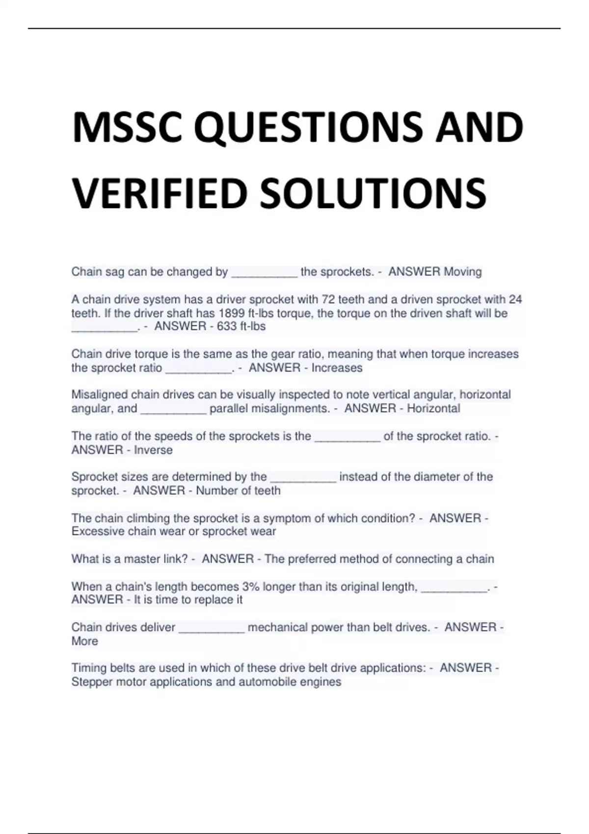 MSSC QUESTIONS AND VERIFIED SOLUTIONS Chain sag can be changed by __________ the sprockets. - ANSWER Moving A chain drive system has a driver sprocket with 72 teeth and a driven sprocket with 24 teeth. If the driver shaft has 1899 ft-lbs torque, the torque on the driven shaft will be __________. - ANSWER - 633 ft-lbs Chain drive torque is the same as the gear ratio, meaning that when torque increases the sprocket ratio __________. - ANSWER - Increases Misaligned chain drives can be visually inspected to note vertical angular, horizontal angular, and __________ parallel misalignments. - ANSWER - Horizontal The ratio of the speeds of the sprockets is the __________ of the sprocket ratio. - ANSWER - Inverse Sprocket sizes are determined by the __________ instead of the diameter of the sprocket. - ANSWER - Number of teeth The chain climbing the sprocket is a symptom of which condition? - ANSWER - Excessive chain wear or sprocket wear What is a master link? - ANSWER - The preferred method of connecting a chain When a chain's length becomes 3% longer than its original length, __________. - ANSWER - It is time to replace it Chain drives deliver __________ mechanical power than belt drives. - ANSWER - More Timing belts are used in which of these drive belt drive applications: - ANSWER - Stepper motor applications and automobile engines What is the belt drive ratio? - ANSWER - Driven sheave pitch diameter divided by the driver sheave pitch diameter The shaft of a belt drive may be bent if the maintenance person performs an alignment check with a straight edge and finds what condition? - ANSWER - The straight edge initially contacts all four points, and after rotating the shaft, it only contacts two points. What is the diameter of the driven pulley that is turning 700 rpm, when the 6-inch driver is rotating 2,100 rpm? - ANSWER - 18 inches The belt drive ratio is also used to calculate the belt drive torque. The formula is __________ proportional to the drive ratio. - ANSWER - Directly Which drive alignment method is faster and more accurate than the straight edge method? - ANSWER - Laser alignment Prior to maintenance, a machine produced 100 parts per minute. The machine was designed to produce 200 parts per minute. The drive belt was replaced. The machine should now be monitored in order to verify that __________. - ANSWER - It will produce 200 parts per minute The following condition is an indicator of improper v-belt alignment. - ANSWER - Excessive bearing and belt wear Measuring a groove angle for wear is a maintenance check performed on what machine component? - ANSWER - Belt drive sheave In contrast to other types of belts, which of the following is determined to be properly adjusted when belt slap is eliminated? - ANSWER - Flat leather belts A gear drive has a minimum of two gears called __________. - ANSWER - Driver and driven Gears are pre-aligned at the factory; however, the shafts of the gear box must be attached using a __________ device to other shafts. - ANSWER - Coupling The gear drive torque is __________ the gear ratio. - ANSWER - Directly proportional to To calculate the speed of a gear, the speed ratio and the __________ will be needed. - ANSWER - Gear ratio Which of the following gear types is used in machine tools like lathes, drills, and planer machines? - ANSWER - Rack and pinion In a spur gearing system, the small gear is called the __________. - ANSWER - Pinion