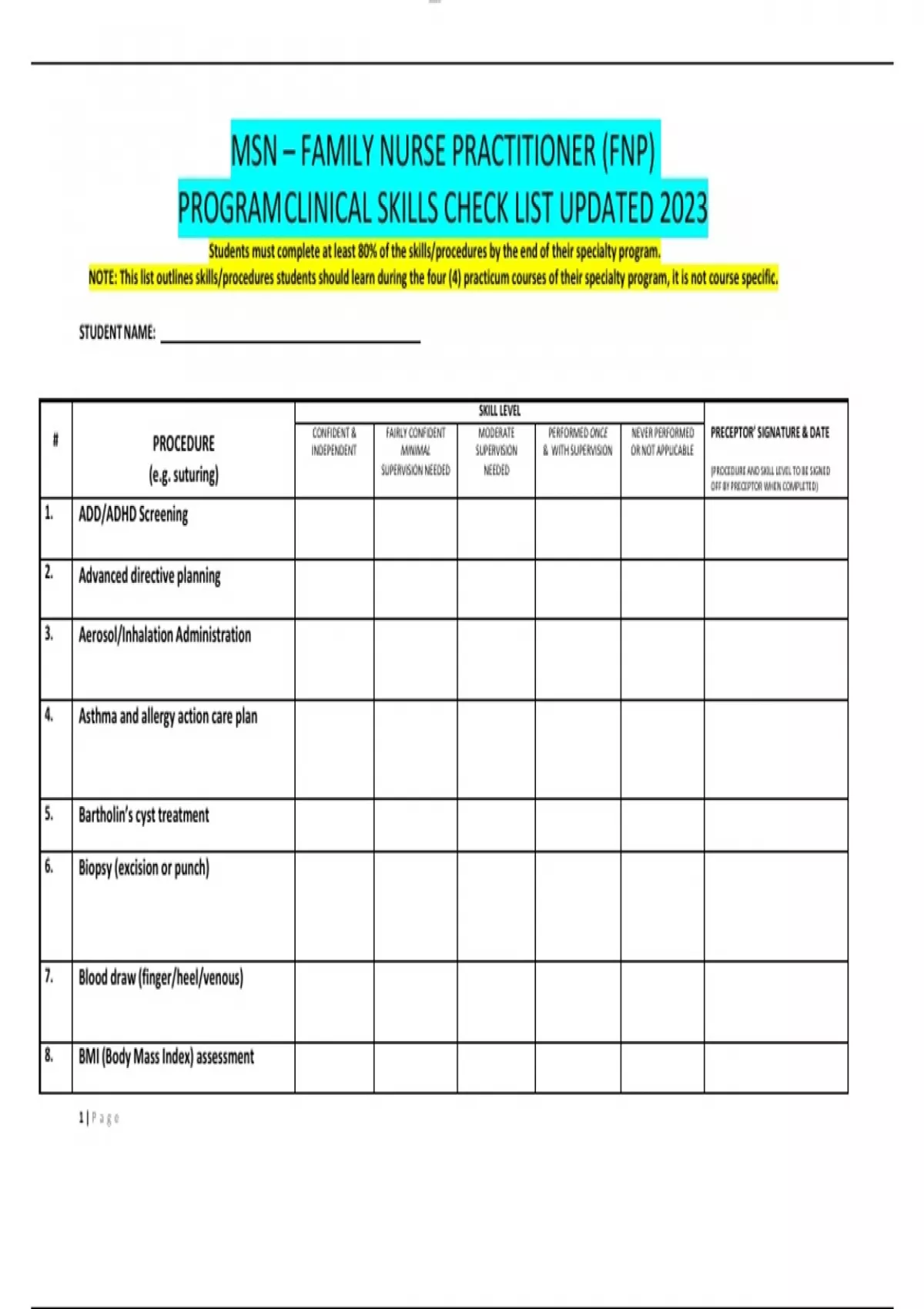 MSN – FAMILY NURSE PRACTITIONER (FNP) PROGRAM CLINICAL SKILLS CHECK LIST UPDATED 2023