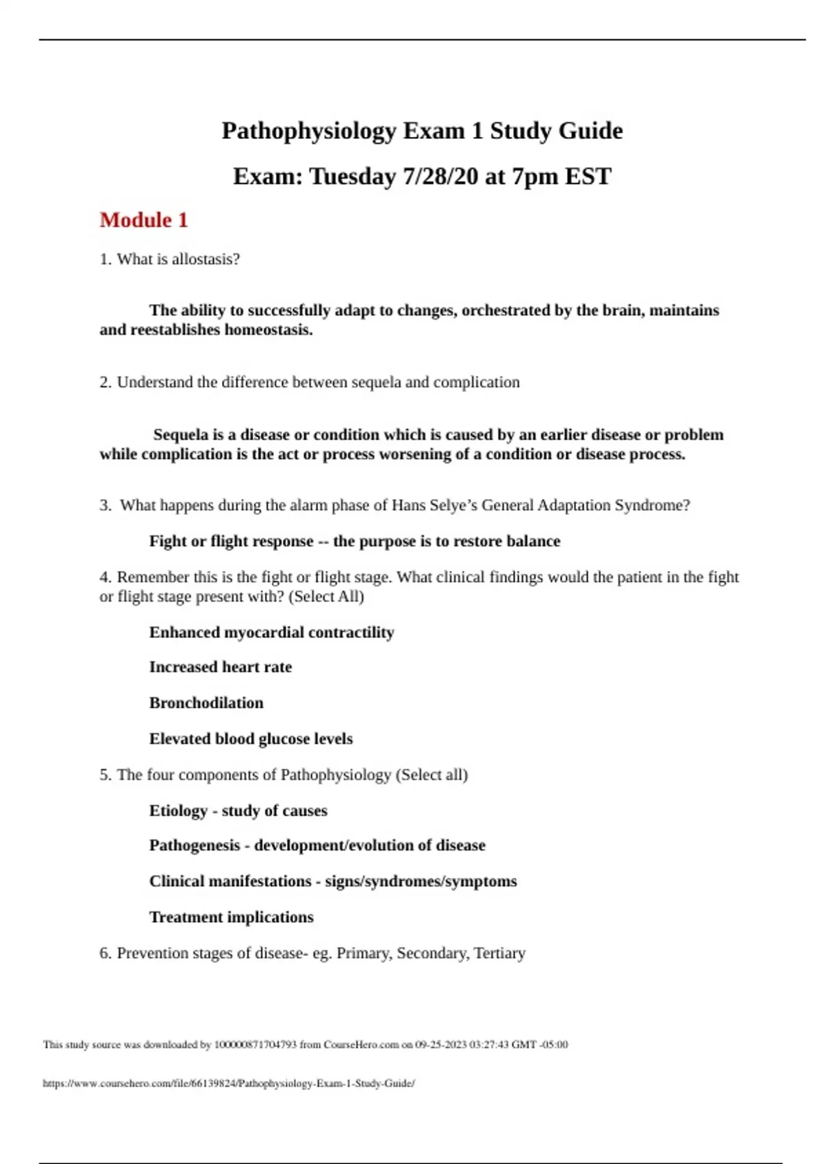 Module 1 1. What is allostasis? The ability to successfully adapt to changes, orchestrated by the brain, maintains and reestablishes homeostasis. 2. Understand the difference between sequela and complication Sequela is a disease or condition which is caused by an earlier disease or problem while complication is the act or process worsening of a condition or disease process. 3. What happens during the alarm phase of Hans Selye’s General Adaptation Syndrome? Fight or flight response -- the purpose is to restore balance 4. Remember this is the fight or flight stage. What clinical findings would the patient in the fight or flight stage present with? (Select All) Enhanced myocardial contractility Increased heart rate Bronchodilation Elevated blood glucose levels 5. The four components of Pathophysiology (Sele