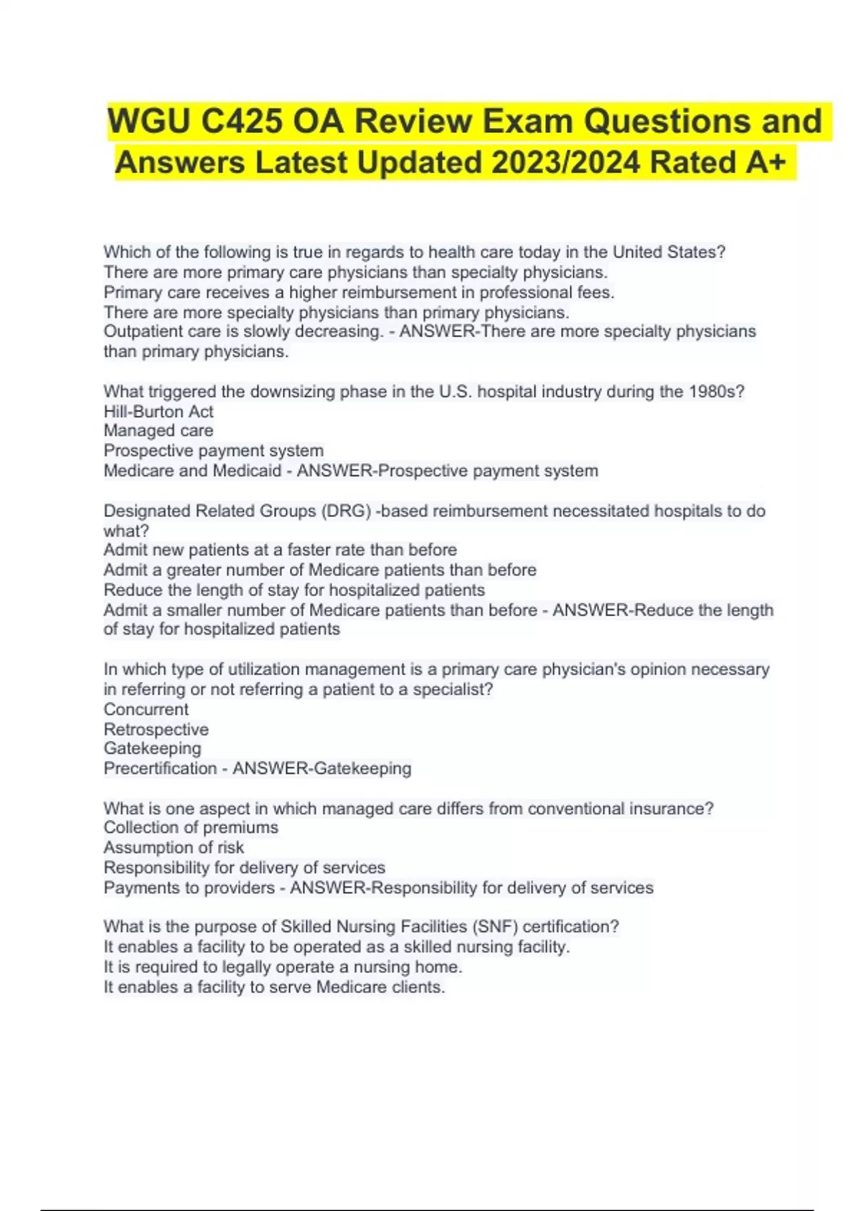 WGU C425 OA Exam Questions and Answers Latest Updated 2023/2024 | 100% Verified. The ideology system that emphasizes the well-being of the community over an individual is called the: social justice system. market justice system. money market system. universal health care system. - ANSWER-social justice system. Which of the following are characteristics of the medical care determinants of health? Health care factors include access to technology but do not include access to alternative therapies. Mental health services are excluded from the WHO's primary health care framework. Whereas some services (preventive and primary care) contribute to general health status, others are more influential in end-of-life situations (hospice and long-term care). The medical system is highly coordinated so that throughout the phases of their lives patients are rarely faced with poor continuity of care. - ANSWER-Whereas some services (preventive and primary care) contribute to general health status, others are more influential in end-of-life situations (hospice and long-term care). Which of the following has been the primary factor that has shielded the U.S. health care system from a major overhaul? Beliefs and values Science and technology Social factors Economic forces - ANSWER-Beliefs and values What is the purpose of a stop-loss provision in a health insurance plan? It limits total out-of-pocket costs. It ensures that the provider will not suffer a loss. It protects the insurance underwriter. It excludes certain types of risks from coverage. - ANSWER-It limits total out-of-pocket costs. Which of the following describes access to care? It is distinguished from acceptability of services. It is rarely predicted by race or income. It is often predicted by income and occupation. Access for disadvantaged populations was absent from legislative history until the ACA. - ANSWER-It is often predicted by income and occupation. Accountable care organizations are: focused on reducing medical malpractice. designed to help increase cooperation between providers across various health care settings to improve Medicare patient outcomes. known for increasing health expenditures and sometimes reducing quality. designed to improve access to care for children and pregnant women. - ANSWERdesigned to help increase cooperation between providers across various health care settings to improve Medicare patient outcomes. How does health care policy-making operate in the United States? Incrementally Large changes at a time Exactly every 10 years Starts in the western states and moves east - ANSWER-Incrementally What two main concerns dominate the debate today over Medicare reform policy? Decrease spending; provide comprehensive coverage Provide comprehensive coverage; raise the age limit Decrease spending; cover children Increase spending; decrease nursing home coverage - ANSWER-Decrease spending; provide comprehensive coverage How was the Medicare PPS system designed to curb escalating health care costs? By providing a general fee schedule for services By providing children tax breaks By providing extensive coverage to the elderly By eliminating sales taxes on health care products - ANSWER-By providing a general fee schedule for services A job description for a physician would be to: determine the significance of a patient's health condition. only prescribe medications to patients. refer commonly occurring conditions to specialists. dispense medications. - ANSWER-determine the significance of a patient's health condition. A specialist must: work in a hospital. gain certification in an area of medical specialization. attend only medical school. serve as a gatekeeper to contain costs. - ANSWER-gain certification in an area of medical specialization. Studies have shown that NPP services can: improve access to primary care. be cost-prohibitive. provide mediocre services at a less expensive price. work independently of physicians. - ANSWER-improve access to primary care. Health service administrators:are responsible for the operational, clinical, and financial outcomes of the entire on the community as a whole rather than treating the ose and treat patient t physicians in patient care. - ANSWER-are responsible for the operational, clinical, and financial outcomes of the entire organization. Public health professionals: are responsible for the operational, clinical, and financial outcomes of the entire organization. focus on the community as a whole rather than treating the individual. diagnose and treat patient illnesses. assist physicians in patient care. - ANSWER-are responsible for the operational, clinical, and financial outcomes of the entire organization. Which of the following is one of the five core disciplines of public health? Biostatistics Dental hygiene Community health Drug development - ANSWER-Biostatistics Uninsured individuals typically tend to be: young adults (ages 25-40). urban dwellers. women. middle class. - ANSWER-young adults (ages 25-40). True or False? Manufacture of generic and other drugs by Asian countries for export helps the economies of both the manufacturing and importing countries. - ANSWERTrue True or False? In a single-payer national health care system, the government generally controls the location of physicians. - ANSWER-False True or False? Providers will likely receive larger and larger payments in future years. - ANSWER-True True or False? No international agency has the authority to enforce compliance with the International Health Regulations. Complete and Close Engage - ANSWER-True Which important change in the U.S. healthcare system was made with the enactment of the Social Security Act? It ensured patients have health care and funding. It granted veterans access to healthcare services. It allowed states to decide if they want to pay for Medicare. It funded payments through the federal government and the states. - ANSWER-It funded payments through the federal government and the states. Medicaid