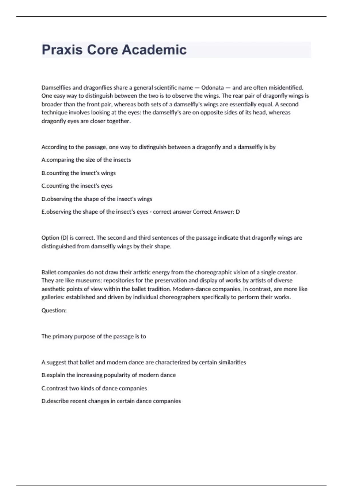 Damselflies and dragonflies share a general scientific name — Odonata — and are often misidentified. One easy way to distinguish between the two is to observe the wings. The rear pair of dragonfly wings is broader than the front pair, whereas both sets of a damselfly's wings are essentially equal. A second technique involves looking at the eyes: the damselfly's are on opposite sides of its head, whereas dragonfly eyes are closer together. According to the passage, one way to distinguish between a dragonfly and a damselfly is by A.comparing the size of the insects B.counting the insect's wings C.counting the insect's eyes D.observing the shape of the insect's wings E.observing the shape of the insect's eyes - correct answer Correct Answer: D Option (D) is correct. The second and third sentences of the passage indicate that dragonfly wings are distinguished from damselfly wings by their shape. Ballet companies do not draw their artistic energy from the choreographic vision of a single creator. They are like museums: repositories for the preservation and display of works by artists of diverse aesthetic points of view within the ballet tradition. Modern-dance companies, in contrast, are more like galleries: established and driven by individual choreographers specifically to perform their works. Question: The primary purpose of the passage is to A.suggest that ballet and modern dance are characterized by certain similarities B.explain the increasing popularity of modern dance C.contrast two kinds of dance companies D.describe re