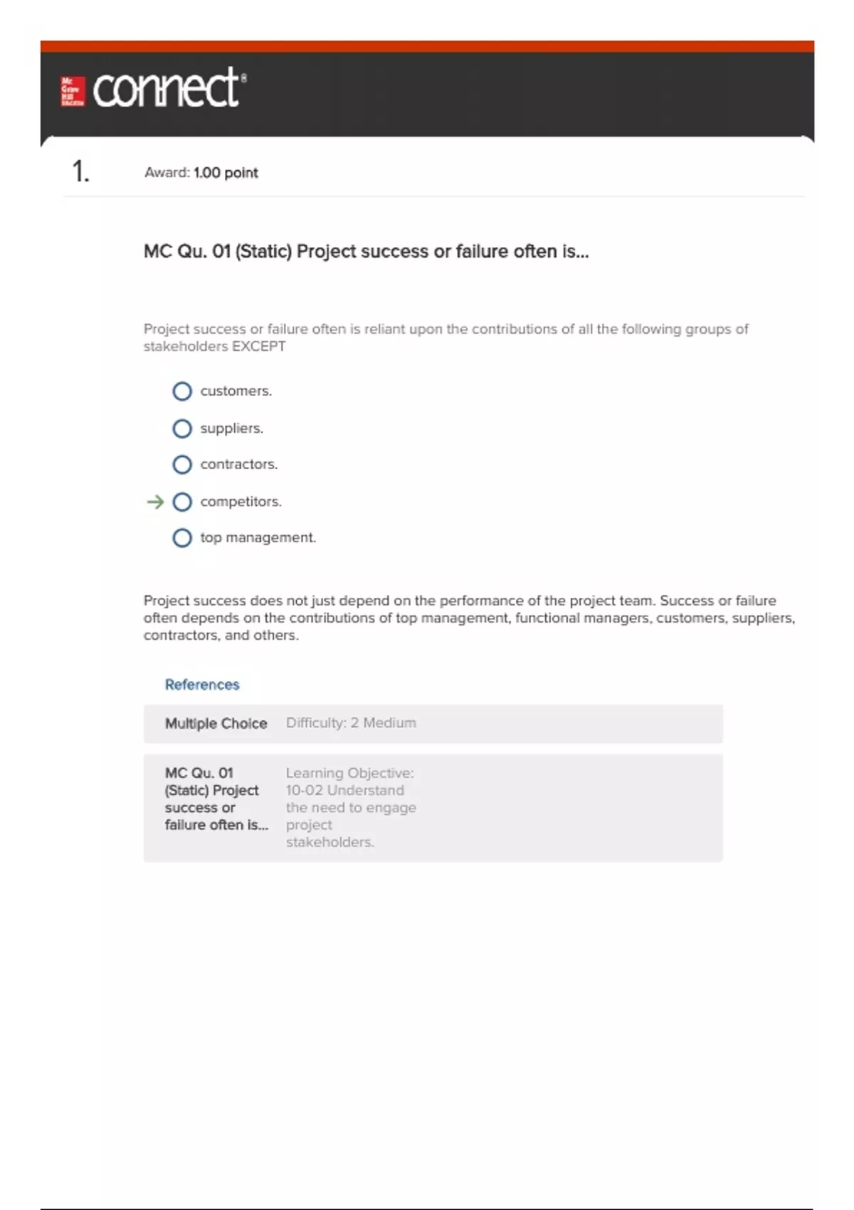 MC Qu. 01 (Static) Project success or failure often is... Project success or failure often is reliant upon the contributions of all the following groups of stakeholders EXCEPT customers. suppliers. contractors. competitors. top management. Project success does not just depend on the performance of the project team. Success or failure often depends on the contributions of top management, functional managers, customers, suppliers, contractors, and others. References Multiple Choice Difficulty: 2 Medium MC Qu. 01 (Static) Project success or failure often is... Learning Objective: 10-02 Understand the need to engage project stakeholders. 2. Award: 1.00 point MC Qu. 02 (Static) Managing a project and leading a... Managing a project and leading a project are two different things. Project leadership is about coping with formulating plans and objectives. monitoring results against plans. change. taking corrective action when necessary. designing structures and procedures. Project managers often have to deviate from what was planned and introduce significant changes in the project scope and schedule to respond to unforeseen threats or opportunities. References Multiple Choice Difficulty: 1 Easy