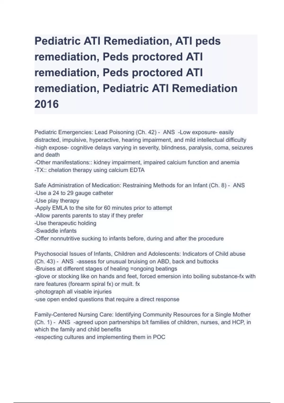 Pediatric ATI Remediation, ATI peds remediation, Peds proctored ATI remediation, Peds proctored ATI remediation, Pediatric ATI Remediation 2016 Pediatric Emergencies: Lead Poisoning (Ch. 42) - ANS -Low exposure- easily distracted, impulsive, hyperactive, hearing impairment, and mild intellectual difficulty -high expose- cognitive delays varying in severity, blindness, paralysis, coma, seizures and death -Other manifestations:: kidney impairment, impaired calcium function and anemia -TX:: chelation therapy using calcium EDTA Safe Administration of Medication: Restraining Methods for an Infant (Ch. 8) - ANS -Use a 24 to 29 gauge catheter -Use play therapy -Apply EMLA to the site for 60 minutes prior to attempt -Allow parents parents to stay if they prefer -Use therapeutic holding -Swaddle infants -Offer nonnutritive sucking to infants before, during and after the procedure Psychosocial Issues of Infants, Children and Adolescents: Indicators of Child abuse (Ch. 43) - ANS -assess for unusual bruising on ABD, back and buttocks -Bruises at different stages of healing =ongoing beatings -glove or stocking like on hands and feet, forced emersion into boiling substance-fx with rare features (forearm spiral fx) or mult. fx -photograph all visable injuries -use open ended questions that require a direct response Family-Centered Nursing Care: Identifying Community Resources for a Single Mother (Ch. 1) - ANS -agreed upon partnerships b/t families of children, nurses, and HCP, in which the family and child benefits -respecting cultures and implementing them in POC