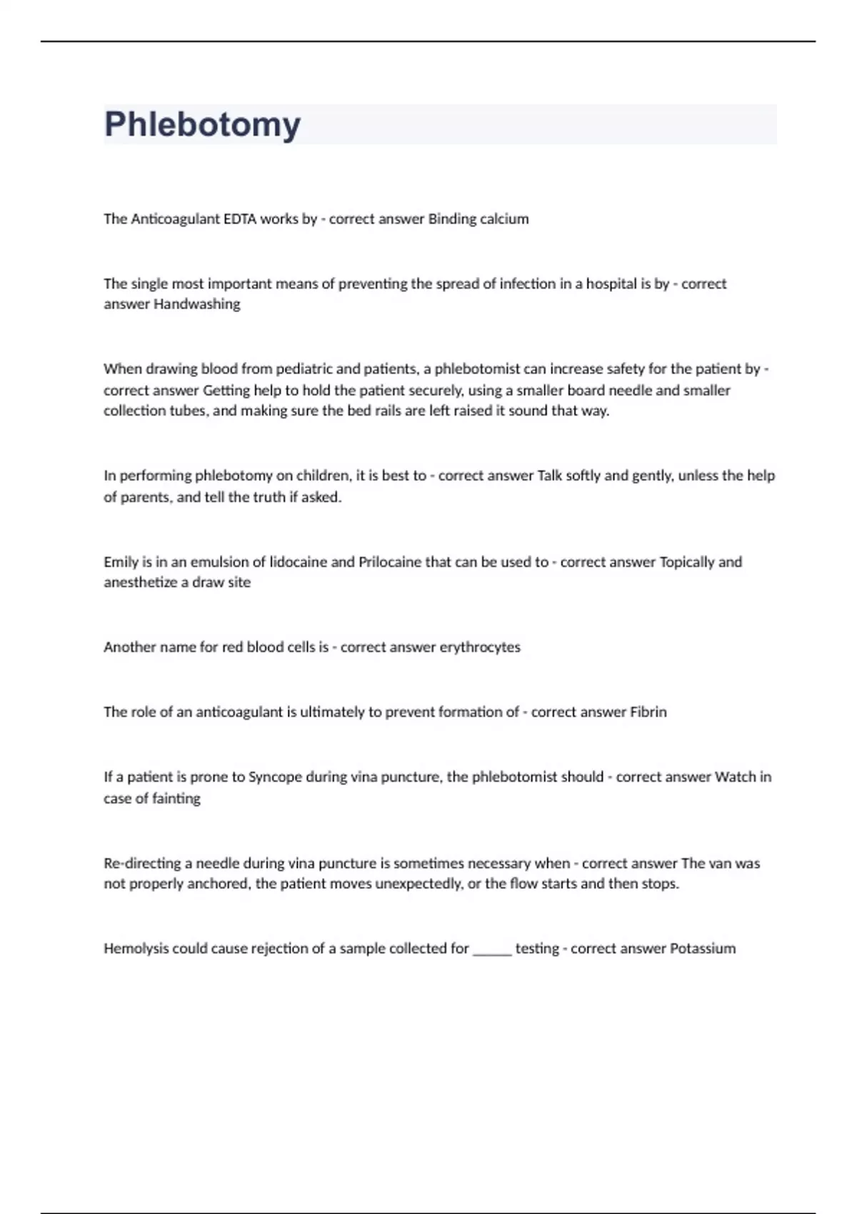 PhlebotomyThe Anticoagulant EDTA works by - correct answer Binding calcium The single most important means of preventing the spread of infection in a hospital is by - correct answer Handwashing When drawing blood from pediatric and patients, a phlebotomist can increase safety for the patient by - correct answer Getting help to hold the patient securely, using a smaller board needle and smaller collection tubes, and making sure the bed rails are left raised it sound that way. In performing phlebotomy on children, it is best to - correct answer Talk softly and gently, unless the help of parents, and tell the truth if asked. Emily is in an emulsion of lidocaine and Prilocaine that can be used to - correct answer Topically and anesthetize a draw site Another name for red blood cells is - correct answer erythrocytes The role of an anticoagulant is ultimately to prevent formation of - correct answer Fibrin If a patient is prone to Syncope during vina puncture, the phlebotomist should - correct answer Watch in case of fainting Re-directing a needle during vina puncture is sometimes necessary when - correct answer The van was not properly anchored, the patient moves unexpectedly, or the flow starts and then stops. Hemolysis could cause rejection of a sample collected for _____ testing - correct answer Potassium
