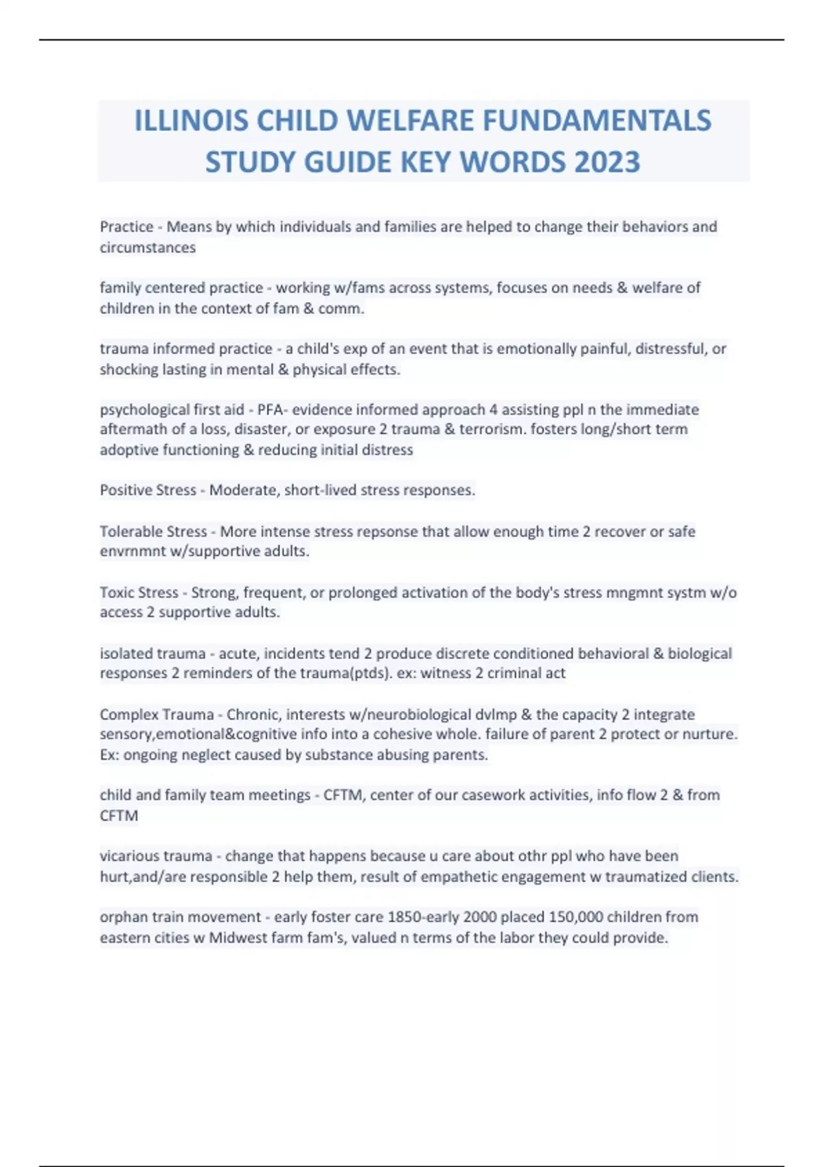 ILLINOIS CHILD WELFARE FUNDAMENTALS STUDY GUIDE KEY WORDS 2023