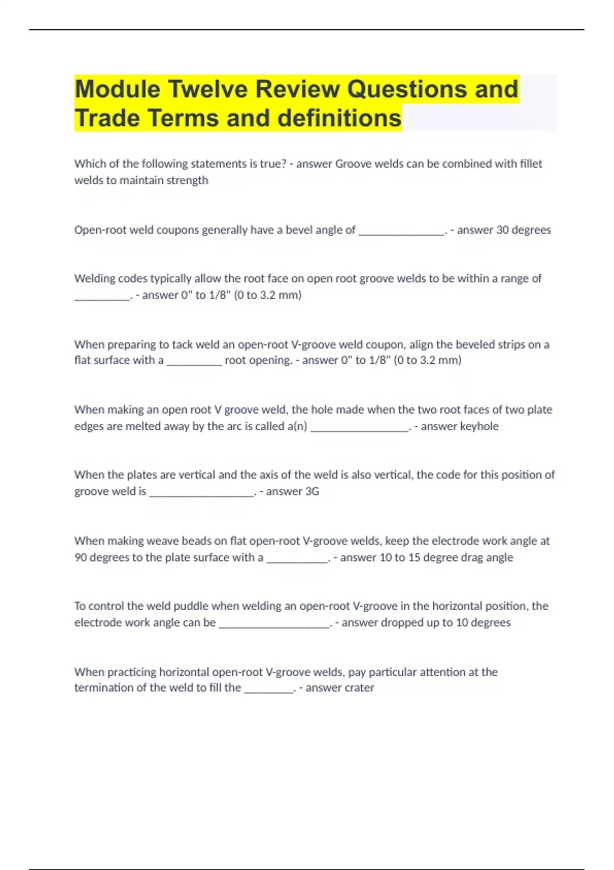 Which of the following statements is true? Groove welds can be combined with fillet welds to maintain strength Open-root weld coupons generally have a bevel angle of ______________. 30 degrees Welding codes typically allow the root face on open root groove welds to be within a range of _________. 0" to 1/8" (0 to 3.2 mm) When preparing to tack weld an open-root V-groove weld coupon, align the beveled strips on a flat surface with a _________ root opening. 0" to 1/8" (0 to 3.2 mm) When making an open root V groove weld, the hole made when the two root faces of two plate edges are melted away by the arc is called a(n) ________________. keyhole When the plates are vertical and the axis of the weld is also vertical, the code for this position of groove weld is _________________. 3G When making weave beads on flat open-root V-groove welds, keep the electrode work angle at 90 degrees to the plate surface with a __________. 10 to 15 degree drag angle To control the weld puddle when welding an open-root V-groove in the horizontal position, the electrode work angle can be __________________. dropped up to 10 degrees When practicing horizontal open-root V-groove welds, pay particular attention at the termination of the weld to fill the ________. crater For better puddle control when welding open-root V-groove welds in the 3G position, _______________. set the amperage to the lower part of the allowable range Trade Terms: the portion of the edge of a part to be joined by a groove weld that has not been beveled or grooved; previously referred to as the land is a _______________. root face Trade terms: grinding a tack weld to a tapered edge is called a _____________________. feather