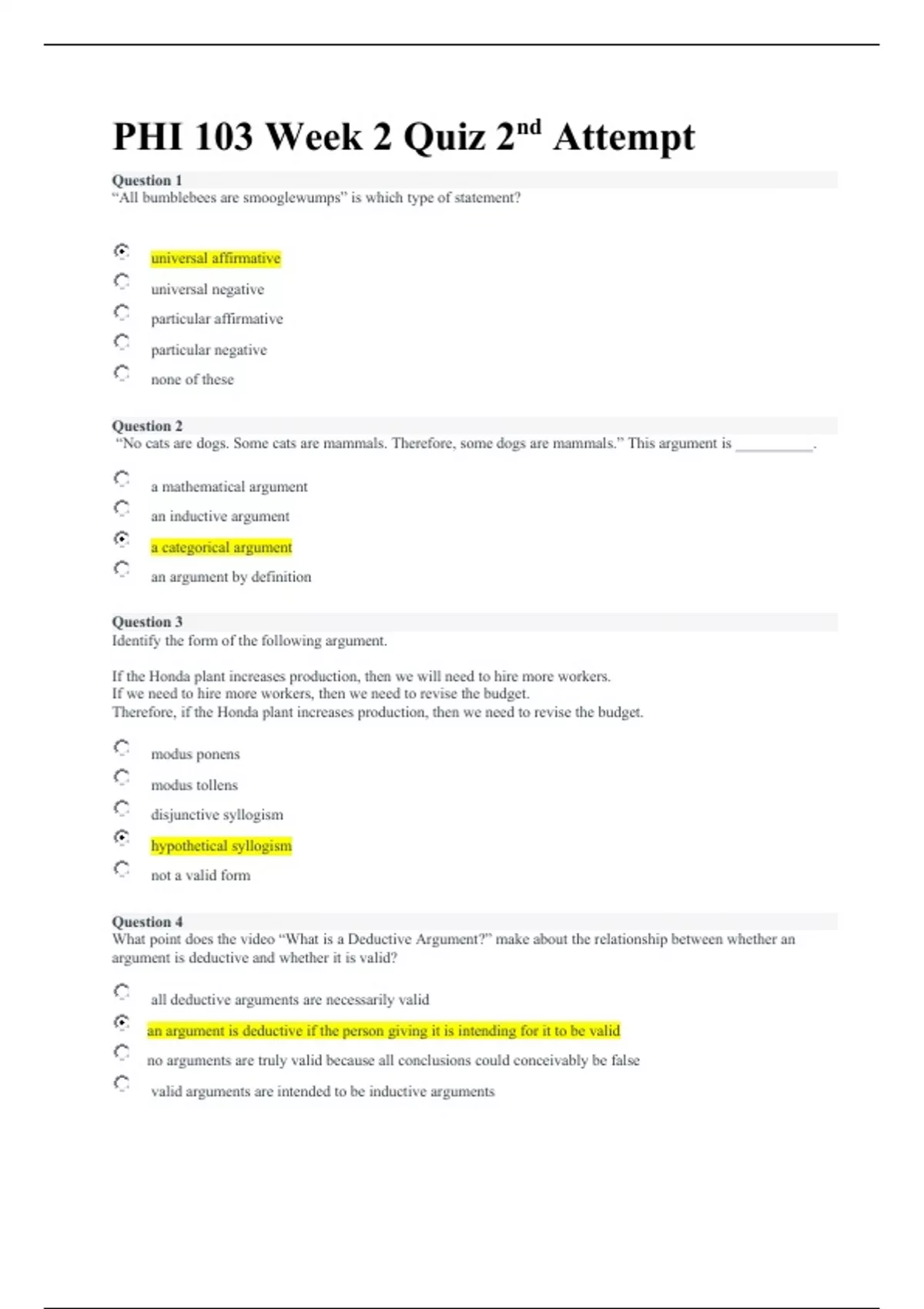 PHI 103 Week 2 Quiz 2nd Attempt Question 1 “All bumblebees are smooglewumps” is which type of statement? Correct! universal affirmative universal negative particular affirmative particular negative none of these Question 2 “No cats are dogs. Some cats are mammals. Therefore, some dogs are mammals.” This argument is __________. a mathematical argument an inductive argument a categorical argument an argument by definition Question 3 Identify the form of the following argument. If the Honda plant increases production, then we will need to hire more workers. If we need to hire more workers, then we need to revise the budget. Therefore, if the Honda plant increases production, then we need to revise the budget. modus ponens modus tollens disjunctive syllogism hypothetical syllogism not a valid form