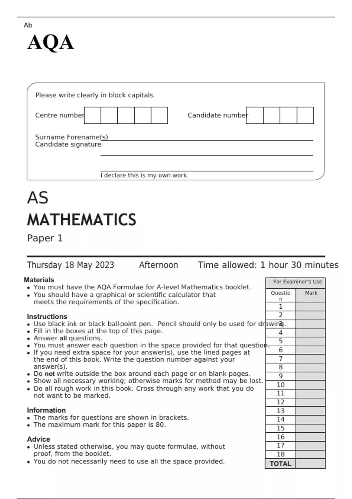 AQA AS MATHEMATICS Paper 1 QUESTION PAPER 2023