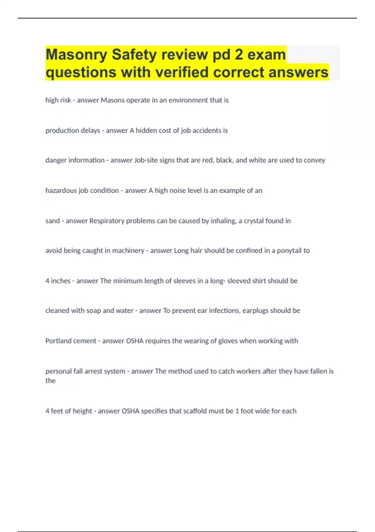 Masonry Safety review /pd 2 exam questions with verified correct answers