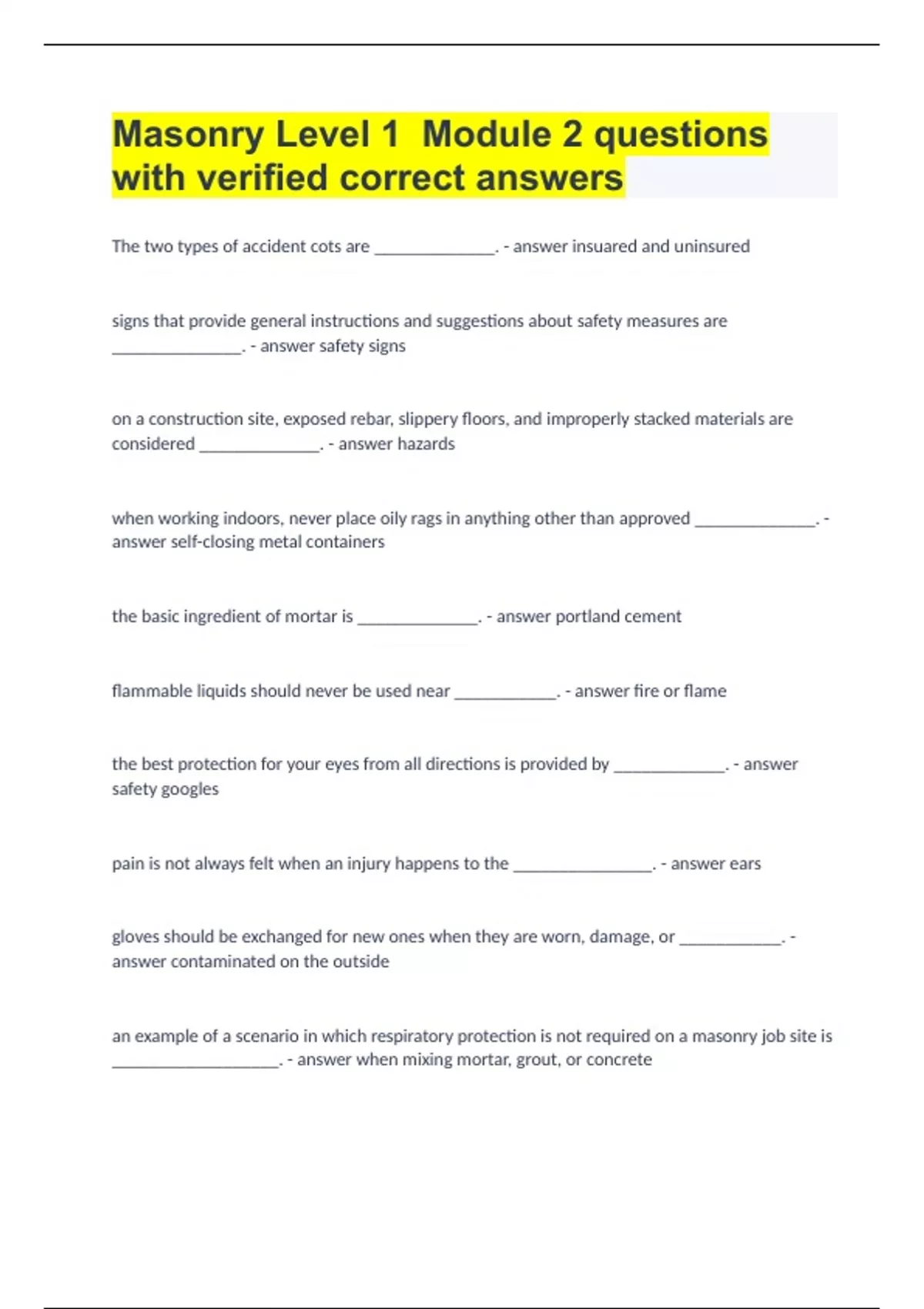 Masonry Level 1 Module 2 questions with verified correct answers.