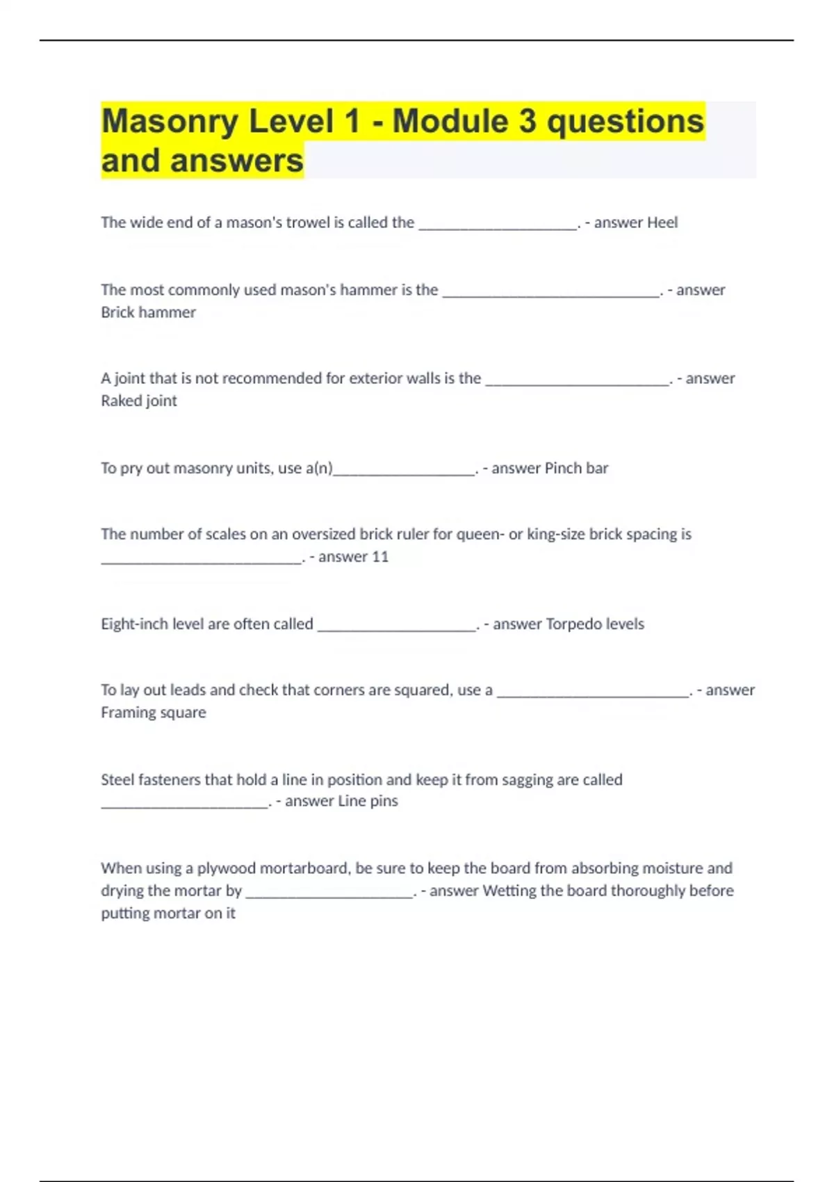 Masonry Level 1 - Module 3 questions and answers