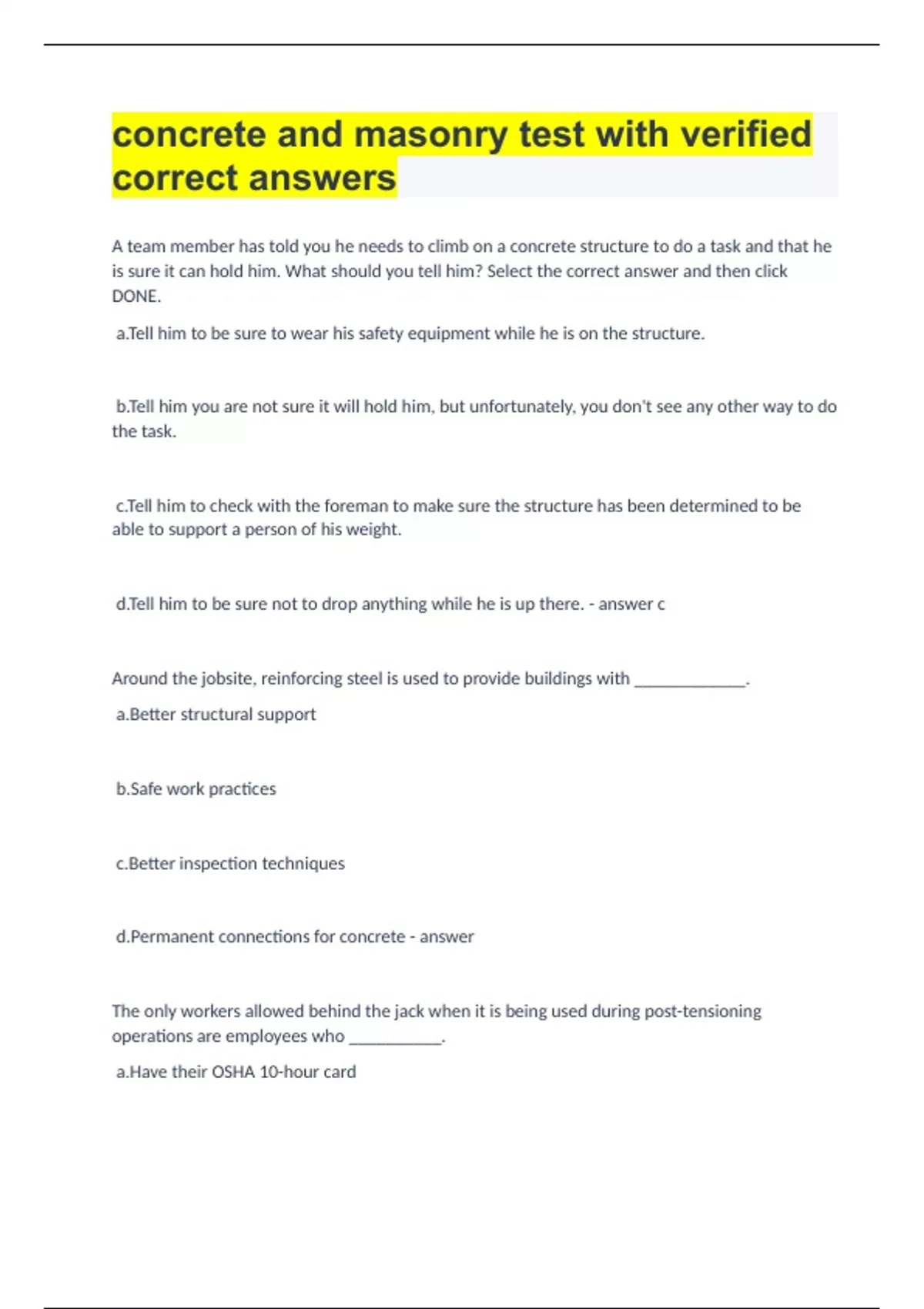 A team member has told you he needs to climb on a concrete structure to do a task and that he is sure it can hold him. What should you tell him? Select the correct answer and then click DONE. a.Tell him to be sure to wear his safety equipment while he is on the structure. b.Tell him you are not sure it will hold him, but unfortunately, you don't see any other way to do the task. c.Tell him to check with the foreman to make sure the structure has been determined to be able to support a person of his weight. d.Tell him to be sure not to drop anything while he is up there. c Around the jobsite, reinforcing steel is used to provide buildings with ____________. a.Better structural support b.Safe work practices c.Better inspection techniques d.Permanent connections for concrete The only workers allowed behind the jack when it is being used during post-tensioning operations are employees who __________. a.Have their OSHA 10-hour card b.Are essential to the jack operation c.Are wearing the proper personal protective equipment d.Are supervisors or project managers b You are in charge of determining the route of a concrete bucket that will soon be loaded and elevated. Which route would be safest? Select the correct answer and then click DONE. a.Through an area where some coworkers are engaged in post-tensioning operations b.Through a cleared out section of the job site that will not be used for another two months c.Through the break area, since lunch is not for another hour d.Through an area where the project engineer is meeting with the foreman b The minimum personal protective equipment is steel toed-shoes and __________. a.Rain gear b.Fall protection c. Hard hat d.Respirator c A construction load may not be placed on a concrete structure unless a person qualified in structural design has determined that the structure is: a. Temporary b.Able to pass inspection c.Accessible d.Able to support the load d You notice there is some protruding reinforcing steel on the job site that workers could fall into. What should you do to protect workers from injury? Select the correct answer and then click DONE. a.Make sure all workers are wearing fall protection equipment. b.Tell workers not to come within 100 feet of the steel. c.Take steps to ensure the protruding steel is properly guarded. d.Inform the supervisor or project manager. c What does assembling and installing post-tensioning systems require? Select the correct answer and then click DONE. a.Specialized knowledge, skills, and equipment b.A minimum of 5 years of work experience c.A minimum of 10 years of work experience d.Only minimal training a What safety measures must be followed when using jacks during post-tensioning operations? Select all that apply and then click DONE. 1.At least three spotters must be present. 2.Only essential employees are allowed behind the jack. 3.Use signs and barriers to limit employee access to the area. 4. No special safety measures are required. 2.3 When is it a safe practice to work under concrete buckets while they are being raised or lowered into position? Select the correct answer then click DONE. a.When you are wearing a hard hat and steel-toed boots b. After you have informed your teammates c.After you have received proper training d. It is never a safe practice d What is the minimum personal protective equipment required when applying a cement, sand, and water mixture through a pneumatic hose? Select the correct answer and then click DONE. a.Protective head equipment b. Protective face equipment c.Steel-toed boots d.Protective head and face equipment d What is the purpose of a pneumatic gate on a concrete bucket? Select the correct answer and then click DONE. a.To protect employees who are riding on the bucket b.To create a good safety latching system c.To add tension to the lift for greater efficiency d. To make it easier to dump the cement b What is a good practice for safe utilization of concrete buckets? Select all that apply and then click DONE. 1.Do not allow employees to ride on top of the buckets 2.Hook additional tools to the bucket that workers above may need 3.Never work under the buckets while they are being raised or lowered 4. Find a route for the elevated bucket that endangers the least possible number of employees 1.3.4 Removable forms are designed to __________. a.To support vertical and lateral loads until the concrete has set b.To support the structure indefinitely c.To improve the look of the concrete d.To offer a backup for shoring and reshoring equipment a You have successfully erected some cast-in-place concrete and remove the forms. You had the shoring equipment inspected before you began, but the latest inspection shows there is some damage to the equipment. What should you do? Select the correct answer and then click DONE. a.Put it aside until you can get the right parts to repair it. b.See if you can find some different equipment. c.Immediately reinforce the equipment so that it is in good working order. d. Use it for one more day, and then have it inspected again. c You should prevent unrolled wire mesh from recoiling by securing each end of the roll or __________. a. Turning the roll over b.Storing the roll vertically c.Using the wire mesh immediately d.Stacking the roll in a designated location a What must formwork for cast-in-place concrete be capable of supporting? Select the correct answer and then click DONE. a.All vertical loads that might be applied to it b. All lateral loads that might be applied to it c.All vertical and lateral loads that might be applied to it d. Specifically-requested vertical loads c When is shoring and reshoring equipment required to be inspected? Select the correct answer and then click DONE. a.Only after it is erected b.Prior to, during, and after concrete placement c.Twice a month d.Annually b What are some of the requirements that must be met when single post shores are used one on top of another? Select all that apply and then click DONE. 1.A quali