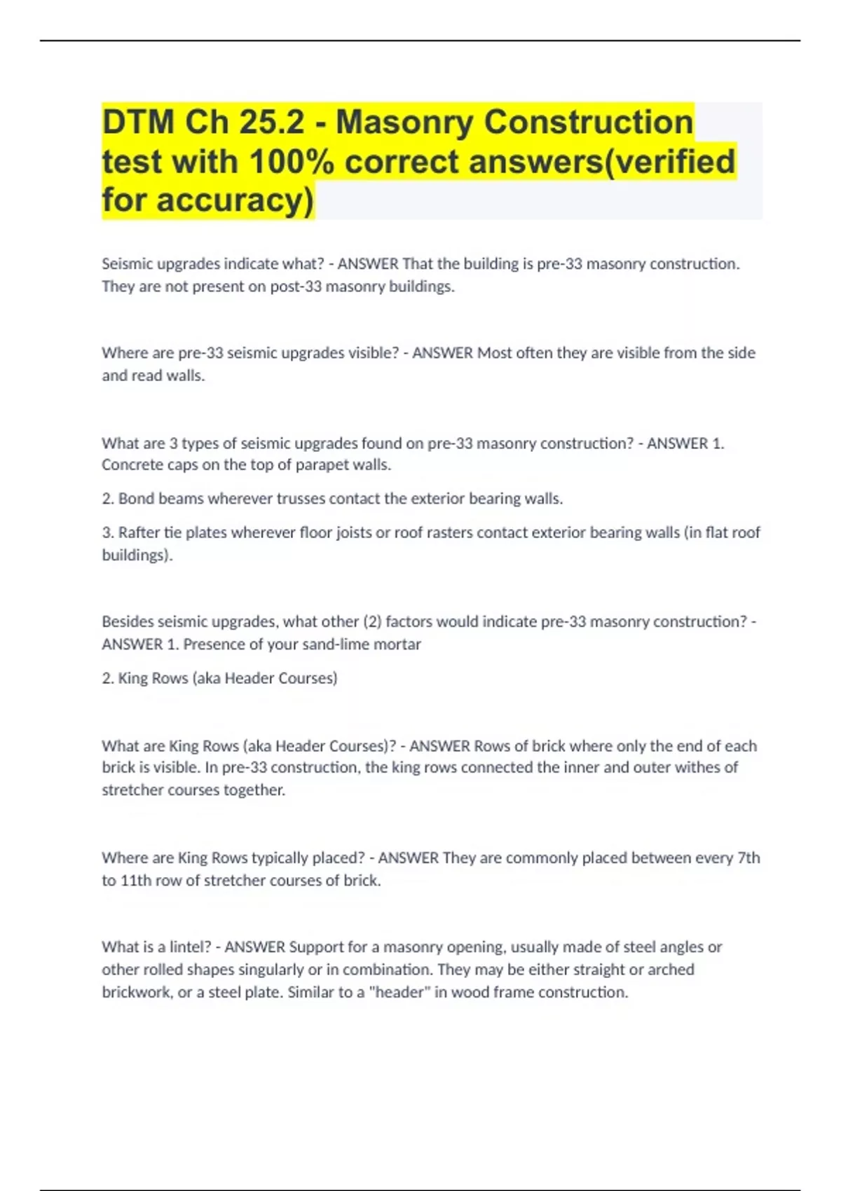 DTM Ch 25.2 - Masonry Construction test with 100% correct answers(verified for accuracy)