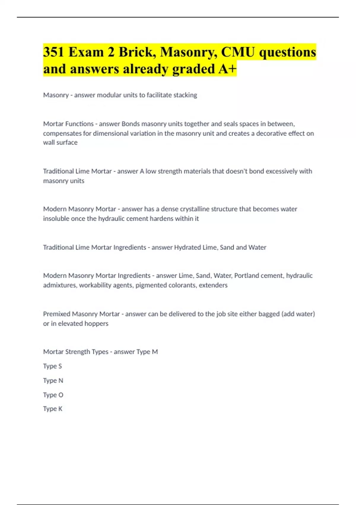 VOL 3, Unit 2 Masonry Construction questions and answers(verified for accuracy)