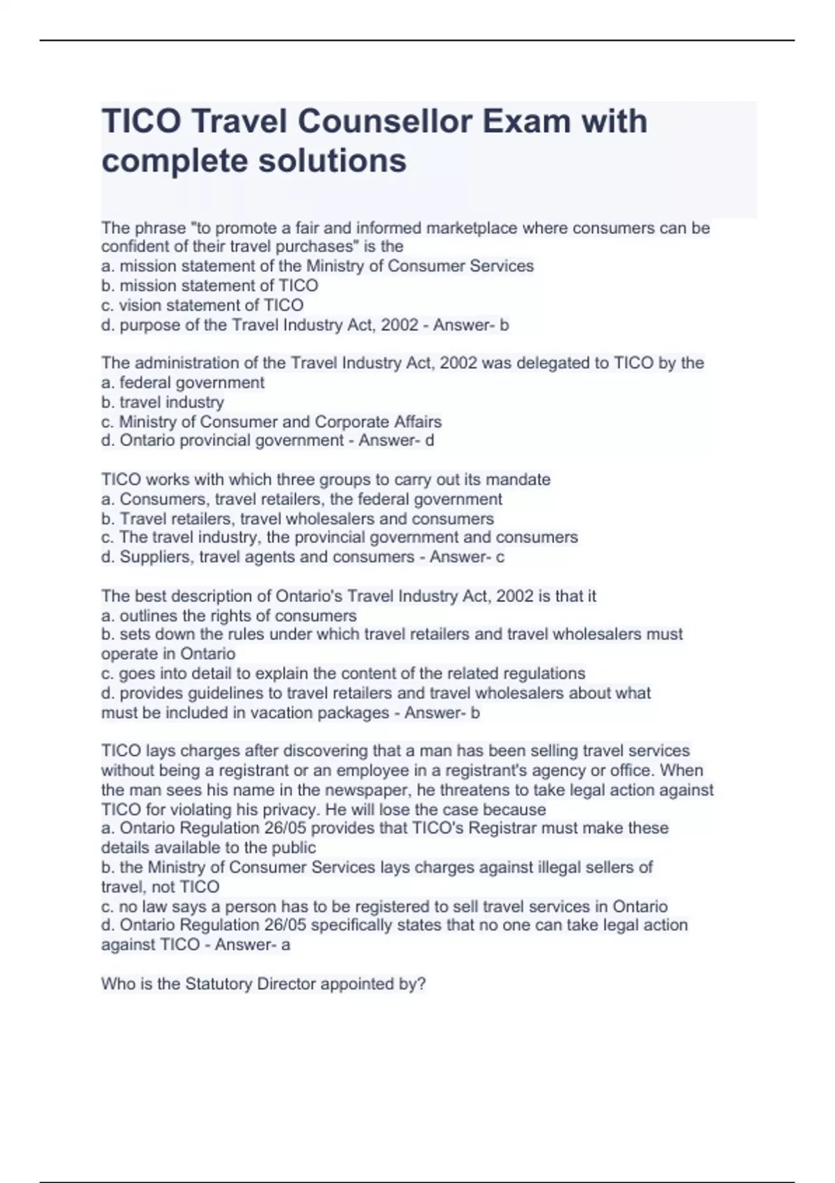 TICO Travel Counsellor Exam with complete solutions