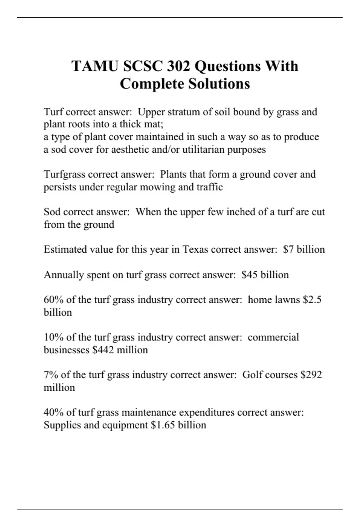Turf correct answer: Upper stratum of soil bound by grass and plant roots into a thick mat; a type of plant cover maintained in such a way so as to produce a sod cover for aesthetic and/or utilitarian purposes Turfgrass correct answer: Plants that form a ground cover and persists under regular mowing and traffic Sod correct answer: When the upper few inched of a turf are cut from the ground Estimated value for this year in Texas correct answer: $7 billion Annually spent on turf grass correct answer: $45 billion 60% of the turf grass industry correct answer: home lawns $2.5 billion 10% of the turf grass industry correct answer: commercial businesses $442 million 7% of the turf grass industry correct answer: Golf courses $292 million 40% of turf grass maintenance expenditures correct answer: Supplies and equipment $1.65 billion 17% of turf grass maintenance expenditures correct answer: Lawn services $702 million other 17% of turf grass maintenance expenditures correct answer: Water $686 million 12% of turf grass maintenance expenditures correct answer: Labor $501 million 7% of turf grass maintenance expenditures correct answer: Fertilizer $275 million 6% of turf grass maintenance expenditures correct answer: Chemicals $231 million 58% of turf acres correct answer: Single family households 19% of turf acres correct answer: counties 5% of turf acres correct answer: cemetaries other 5% of turf acres correct answer: others 4% of turf acres correct answer: airports 3% of turf acres correct answer: golf courses 78% of turf labor expenditures correct answer: mowing 10% of turf labor expenditures correct answer: Irrigation 5% of turf labor expenditures correct answer: materials application other 5% of turf labor expenditures correct answer: other 2% of turf labor expenditures correct answer: turf renovation/aeration 83% of mowing labor expenditures correct answer: Golf courses