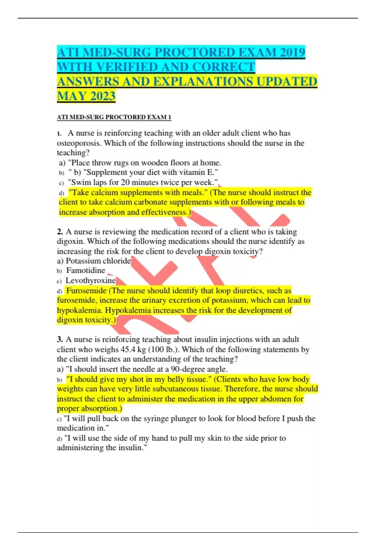 ATI MED-SURG PROCTORED EXAM 2019 WITH VERIFIED AND CORRECT ANSWERS AND EXPLANATIONS UPDATED MAY 2023 ATI MED-SURG PROCTORED EXAM 1 1. A nurse is reinforcing teaching with an older adult client who has osteoporosis. Which of the following instructions should the nurse in the teaching? a) "Place throw rugs on wooden floors at home. b) " b) "Supplement your diet with vitamin E." c) "Swim laps for 20 minutes twice per week." d) "Take calcium supplements with meals." (The nurse should instruct the client to take calcium carbonate supplements with or following meals to increase absorption and effectiveness.) 2. A nurse is reviewing the medication record of a client who is taking digoxin. Which of the following medications should the nurse identify as increasing the risk for the client to develop digoxin toxicity? a) Potassium chloride b) Famotidine c) Levothyroxine d) Furosemide (The nurse should identify that loop diuretics, such as furosemide, increase the urinary excretion of potassium, which can lead to hypokalemia. Hypokalemia increases the risk for the development of digoxin toxicity.) 3. A nurse is reinforcing teaching about insulin injections with an adult client who weighs 45.4 kg (100 lb.). Which of the following statements by the client indicates an understanding of the teaching? a) "I should insert the needle at a 90-degree angle. b) "I should give my shot in my belly tissue." (Clients who have low body weights can have very little subcutaneous tissue. Therefore, the nurse should instruct the client to administer the medication in the upper abdomen for proper absorption.) c) "I will pull back on the syringe plunger to look for blood before I push the medication in." d) "I will use the side of my hand to pull my skin to the side prior to administering the insulin." 4. A nurse is reinforcing discharge teaching for a client who had a mechanical mitral valve replacement. Which of the following statements by the client indicates an understanding of the teaching? a) "I will notify my dentist about this procedure." (The nurse should instruct the client to notify his dentist about the mechanical mitral valve replacement before any procedures so antibiotic therapy can be initiated to reduce the risk of endocardial infection.) b) "I will take an enteric-coated aspirin daily." c) "I will use a firm-bristled toothbrush." d) "I will weigh myself once a week." 5. A nurse is reviewing the medical record for an older adult client who is experiencing nausea and vomiting. Based on the client data, which of the following actions should the nurse take? (Click on the “Exhibit” button for additional client information. There are three tabs that contain separate categories of data.) View the Exhibit Exhibit 1 Exhibit 2 Exhibit 3 Diagnosis Results Sodium 142 mEq/ Potassium 4.2 mEq/L BUN 36 mg/dL Creatinine 1.4 mg/dL Nurses’ Notes 1200: Alert and oriented x3 Lungs clear to auscultation Decreased skin turgor Dry mucous membranes Graphic Record Temperature 0800: 37.7° C (99.9° F) 1200: 37.2° C (99.0° F) Pulse 0800: 96/min 1200:105/min Respiratory rate 0800: 18/min 1200: 20/min Blood pressure 0800; 118/62 mmHg 1200: 104/65 mm Hg a) Encourage the client to ambulate. b) Administer an antipyretic medication. c) Notify the charge nurse of the client's BUN level (The client's BUN level is above the expected reference range of 10 to 20 mg/dL, which indicates dehydration and impaired renal function. The nurse should notify the charge nurse of this finding and anticipate interventions to restore the client's fluid volume.) d) Keep the temperature in the client's room warm. 6. A nurse is providing information regarding transmission-based precautions for a client who has Clostridium difficileto an assistive personnel (AP). Which of the following instructions should the nurse include? (Select all that apply). a) "Provide the client with disposable utensils and dishes for meals." (Clients who have C. difficile require contact precautions, which include using disposable utensils and dishes during meals to prevent exposure to contaminants by others.) b) "Leave blood pressure equipment in the client's room." (When using contact precautions, the health care staff should dedicate equipment to single-client use to prevent transmission of the pathogen.) c) "Clean contaminated surfaces with a bleach solution." (The health care staff should use a bleach solution to clean equipment to prevent transmission of the pathogen.) d) "Use an alcohol-based hand sanitizer after client care." e) "Wear a face mask when in the client's room." 7. A nurse is admitting a client who is suspected having active tuberculosis (TB). Which of the following actions should the nurse take first? (chap. 20) a) Administer antituberculosis medication. b) Institute airborne precautions. (The greatest risk from this client is transmitting TB to staff and other clients. Therefore, the first action the nurse should take is to implement airborne precautions.) c) Obtain sputum cultures. d) Auscultate breath sounds. 8. A nurse is caring for a client who is postoperative and has a Jackson-Pratt drain. Which of the following actions should the nurse take? a) Fill the bulb reservoir with 0.9% sodium chloride. b) Allow the Jackson-Pratt drain to hang freely. c) Cut a slit in a gauze sponge and apply it around the tubing insertion site. d) Compress the bulb reservoir and then close the drainage valve. (The nurse should fully compress the bulb reservoir and then replace the valve plug using aseptic technique to establish suction after emptying or activating a Jackson-Pratt drain.) 9. A nurse is reinforcing teaching with the parent of a toddler who has type I diabetes mellitus and whose prescription has been changed from regular insulin to lispro insulin. Which of the following information should the nurse include in the teaching? a) Lispro is given once a day. b) Lispro should be given before eating. (Lispro insulin should be given around mealtime, within 15 min