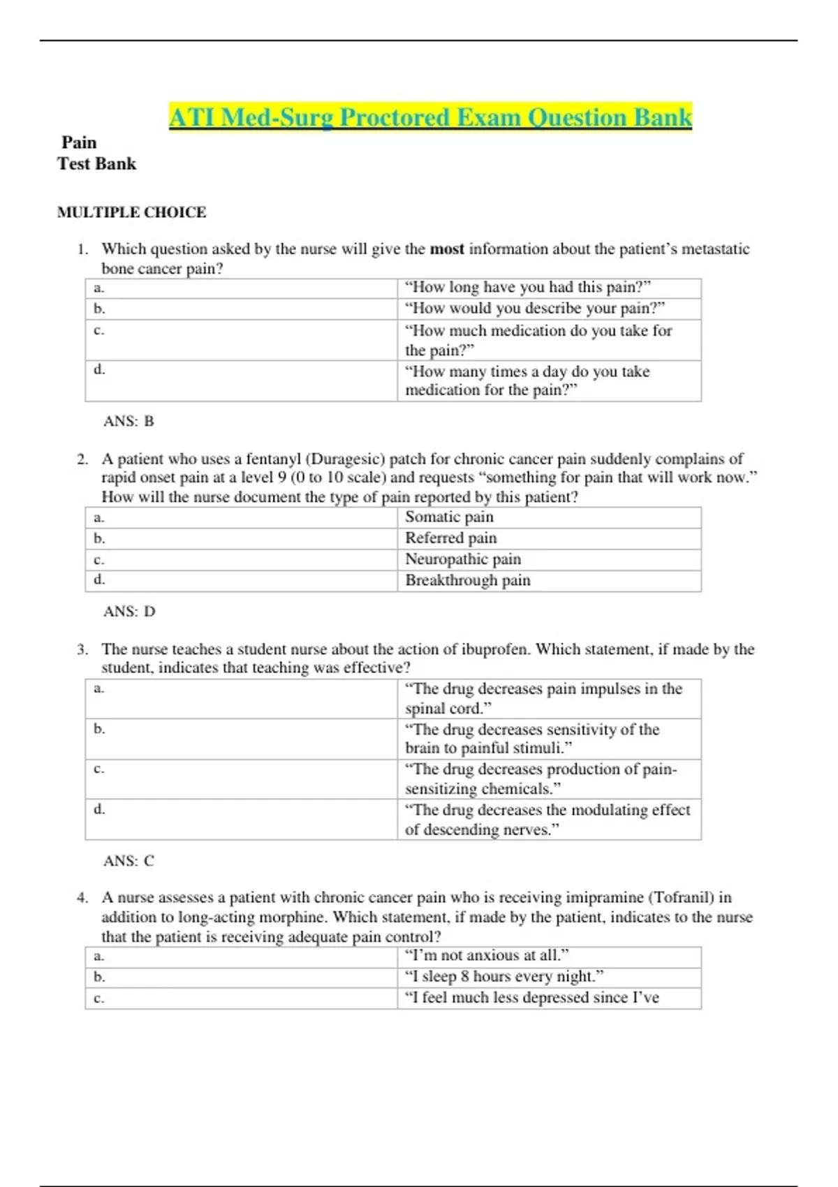 ATI Med-Surg Proctored Exam Question Bank Pain Test Bank MULTIPLE CHOICE 1. Which question asked by the nurse will give the most information about the patient’s metastatic bone cancer pain? a. “How long have you had this pain?” b. “How would you describe your pain?” c. “How much medication do you take for the pain?” d. “How many times a day do you take medication for the pain?” ANS: B 2. A patient who uses a fentanyl (Duragesic) patch for chronic cancer pain suddenly complains of rapid onset pain at a level 9 (0 to 10 scale) and requests “something for pain that will work now.” How will the nurse document the type of pain reported by this patient? a. Somatic pain b. Referred pain c. Neuropathic pain d. Breakthrough pain ANS: D 3. The nurse teaches a student nurse about the action of ibuprofen. Which statement, if made by the student, indicates that teaching was effective? a. “The drug decreases pain impulses in the spinal cord.” b. “The drug decreases sensitivity of the brain to painful stimuli.” c. “The drug decreases production of painsensitizing chemicals.” d. “The drug decreases the modulating effect of descending nerves.” ANS: C 4. A nurse assesses a patient with chronic cancer pain who is receiving imipramine (Tofranil) in addition to long-acting morphine. Which statement, if made by the patient, indicates to the nurse that the patient is receiving adequate pain control? a. “I’m not anxious at all.” b. “I sleep 8 hours every night.” c. “I feel much less depressed since I’ve been taking the Tofranil.” d. “The pain is manageable and I can accomplish my desired activities. ANS: D 5. A patient with chronic back pain has learned to control the pain with the use of imagery and hypnosis. The patient’s spouse asks the nurse how these techniques work. Which response by the nurse is best? a. “The strategies work by affecting the perception of pain.” b. “These techniques block the pain pathways of the nerves.” c. “Both strategies prevent transmission of painful stimuli to the brain.” d. “The therapies slow the release of chemicals in the spinal cord that cause pain.” ANS: A 6. A patient who is receiving sustained-release morphine sulfate (MS Contin) every 12 hours for chronic pain experiences level 9 (0 to 10 scale) breakthrough pain and anxiety. Which action by the nurse is best? a. Provide amitriptyline (Elavil) 10 mg orally. b. Administer lorazepam (Ativan) 1 mg orally. c. Offer ibuprofen (Motrin) 400 to 800 mg orally. d. Give immediate-release morphine 30 mg orally. ANS: D 7. A patient with chronic neck pain is seen in the pain clinic for follow-up. In order to evaluate whether the pain management is effective, which question is best for the nurse to ask? a. “Can you describe the quality of your pain?” b. “Has there been a change in the pain location?” c. “How would you rate your pain on a 0 to 10 scale?” d. “Does the pain keep you from doing things you enjoy?” ANS: D 8. A patient with second-degree burns has been receiving hydromorphone through patientcontrolled analgesia (PCA) for a week. The patient wakes up frequently during the night complaining of pain. What action by the nurse is most appropriate? a. Administer a dose of morphine every 1 to 2 hours from the PCA machine while the patient is sleeping. b. Consult with the health care provider about using a different treatment protocol to control the patient’s pain. c. Request that the health care provider order a bolus dose of morphine to be given when the patient awakens with pain. d. Teach the patient to push the button every 10 minutes for an hour before going to sleep, even if the pain is minimal. ANS: B 9. The nurse assesses that a patient receiving epidural morphine has not voided for over 10 hours. What action should the nurse take initially? a. Monitor for withdrawal symptoms. b. Place an indwelling urinary catheter. c. Ask if the patient feels the need to void. d. Document this allergic reaction in the patient’s chart. ANS: C 10. When visiting a hospice patient, the nurse assesses that the patient has a respiratory rate of 11 breaths/minute and complains of severe pain. Which action is best for the nurse to take? a. Inform the patient that increasing the morphine will cause the respiratory drive to fail. b. Tell the patient that additional morphine can be administered when the respirations are 12. c. Titrate the prescribed morphine dose upward until the patient indicates adequate pain relief. d. Administer a nonopioid analgesic, such as a nonsteroidal antiinflammatory drug (NSAID), to improve patient pain control. ANS: C 11. The nurse is completing the medication reconciliation form for a patient admitted with chronic cancer pain. Which medication is of most concern to the nurse? a. Amitriptyline (Elavil) 50 mg at bedtime b. Ibuprofen (Advil) 800 mg 3 times daily c. Oxycodone (OxyContin) 80 mg twice daily d. Meperidine (Demerol) 25 mg every 4 hours ANS: D 12. The nurse reviews the medication administration record in order to choose the most appropriate pain medication for a patient with cancer who describes the pain as “deep, aching and at a level 8 on a 0 to 10 scale”. Which medication should the nurse administer? a. Fentanyl (Duragesic) patch b. Ketorolac (Toradol) tablets c. Hydromorphone (Dilaudid) IV d. Acetaminophen (Tylenol) suppository ANS: C 13. The nurse is caring for a patient who has diabetes and complains of chronic burning leg pain even when taking oxycodone (OxyContin) twice daily. When reviewing the orders, which prescribed medication is the best choice for the nurse to administer as an adjuvant to decrease the patient’s pain? a. Aspirin (Ecotrin) b. Celecoxib (Celebrex) c. Amitriptyline (Elavil) d. Acetaminophen (Tylenol) ANS: C 14. A patient who uses a fentanyl (Duragesic) patch for chronic abdominal pain caused by ovarian cancer asks the nurse to administer the prescribed hydrocodone (Vicodin) tablets, but th
