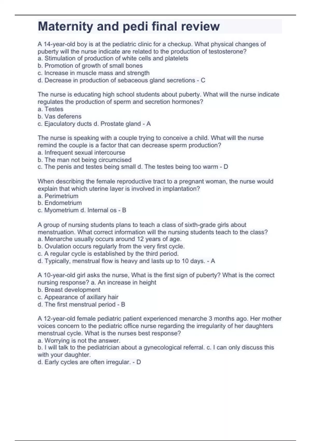 A 14-year-old boy is at the pediatric clinic for a checkup. What physical changes of puberty will the nurse indicate are related to the production of testosterone? a. Stimulation of production of white cells and platelets b. Promotion of growth of small bones c. Increase in muscle mass and strength d. Decrease in production of sebaceous gland secretions - C