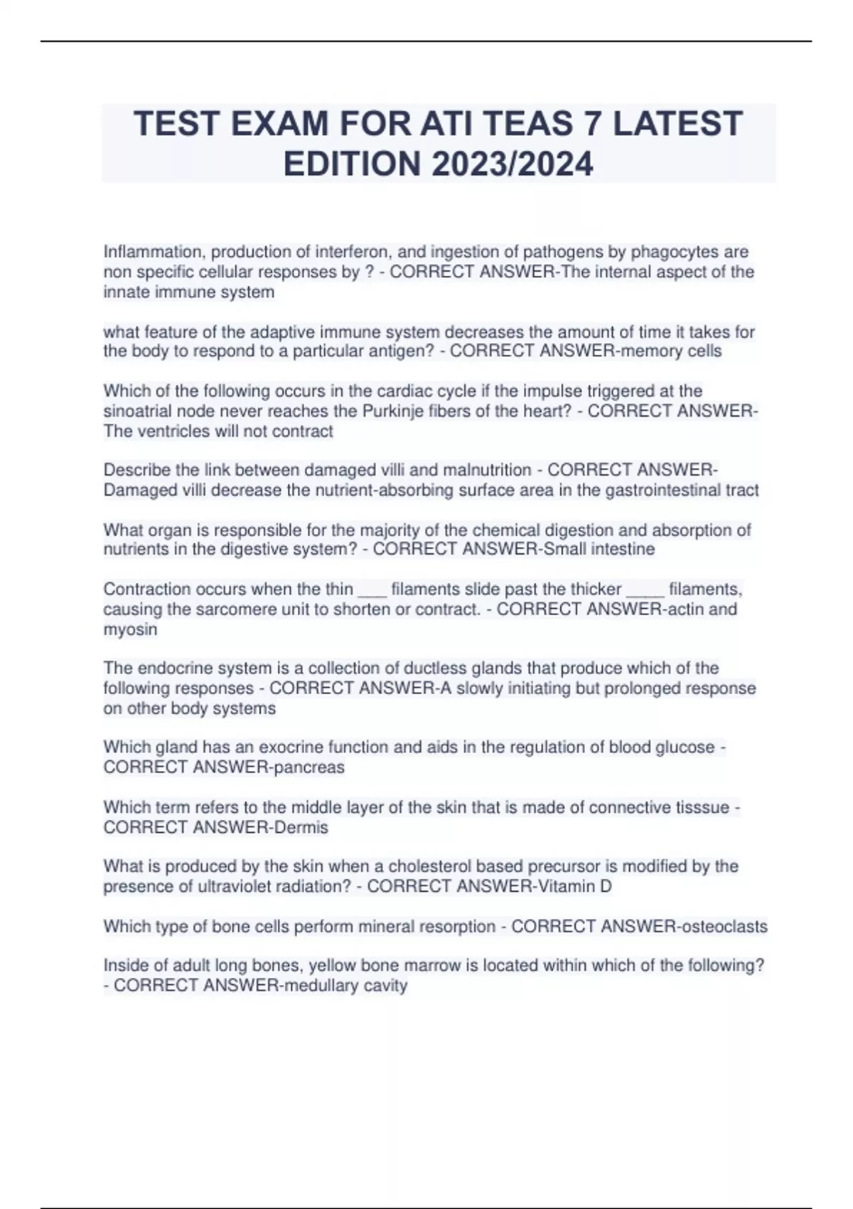 TEST EXAM FOR ATI TEAS 7 LATEST EDITION 2023/2024 Inflammation, production of interferon, and ingestion of pathogens by phagocytes are non specific cellular responses by ? - CORRECT ANSWER-The internal aspect of the innate immune system what feature of the adaptive immune system decreases the amount of time it takes for the body to respond to a particular antigen? - CORRECT ANSWER-memory cells Which of the following occurs in the cardiac cycle if the impulse triggered at the sinoatrial node never reaches the Purkinje fibers of the heart? - CORRECT ANSWERThe ventricles will not contract Describe the link between damaged villi and malnutrition - CORRECT ANSWERDamaged villi decrease the nutrient-absorbing surface area in the gastrointestinal tract What organ is responsible for the majority of the chemical digestion and absorption of nutrients in the digestive system? - CORRECT ANSWER-Small intestine Contraction occurs when the thin ___ filaments slide past the thicker ____ filaments, causing the sarcomere unit to shorten or contract. - CORRECT ANSWER-actin and myosin The endocrine system is a collection of ductless glands that produce which of the following responses - CORRECT ANSWER-A slowly initiating but prolonged response on other body systems Which gland has an exocrine function and aids in the regulation of blood glucose - CORRECT ANSWER-pancreas Which term refers to the middle layer of the skin that is made of connective tisssue - CORRECT ANSWER-Dermis What is produced by the skin when a cholesterol based precursor is modified by the presence of ultraviolet radiation? - CORRECT ANSWER-Vitamin D Which type of bone cells perform mineral resorption - CORRECT ANSWER-osteoclasts Inside of adult long bones, yellow bone marrow is located within which of the following? - CORRECT ANSWER-medullary cavity What type of tissue serves to fasten and support body parts - CORRECT ANSWERConnective What leaves the body via deferens - CORRECT ANSWER-Gametes What reproductive organs produces sperm in males and ova in females - CORRECT ANSWER-Gonads What is the term used to describe an action potential jumping from node to node in an axon - CORRECT ANSWER-Saltatory conduction A polysaccharide can be described as which of the following - CORRECT ANSWER-A carbohydrate that is made of many sugar molecules What is a chemical reaction between two molecules in which a water molecule is released and a covalent bond forms - CORRECT ANSWER-Dehydration reaction Which is a triplet of nitrogenous bases that codes for an amino acid - CORRECT ANSWER-Codon Inheritance can be described as what? - CORRECT ANSWER-transmission of characteristics to offspring Genetic information describing the characteristics of an organism is sound in which of the following - CORRECT ANSWER-Nucleus What best describes the result of mitosis - CORRECT ANSWER-New body cells that replace damaged body cells What is the function of ribosomes - CORRECT ANSWER-they facilitate protein synthesis Correctly describes a major metabolic pathway - CORRECT ANSWER-Respiration is an oxidative, degradative pathway atomic mass has a decimal because it is the average ______ of all the isotopes for a particular element. The atomic number of an element is the number of ___ in its nucleus - CORRECT ANSWER-mass - protons An atom that has lost an electron becomes____ in charge and is called a ____ - CORRECT ANSWER-Positive, cation Which of the following statements is true about protons - CORRECT ANSWER-They are located in the nucleus of an atom What is characteristic of a graph displaying the physical states of a substance under varying temperature and pressure - CORRECT ANSWER-Having temperature and pressure as its axes and is called a phase diagram Each elements atomic number is determined by the number of what in its atom? - CORRECT ANSWER-Protons The number of which of the following particles will differ for each isotope of the same element - CORRECT ANSWER-Neutrons in it's nucleus What best describes the mass of an object - CORRECT ANSWER-An extensive property and physical property Which characteristics applies to the bonds holding together nonpolar covalent molecules - CORRECT ANSWER-They share electrons between atoms and result in a balanced distribution of charges throughout the molecule. What is the appropriate prefix measure of the amount of space taken up by a penny - CORRECT ANSWER-Milli Which statement is true about understanding magnitude when describing relationships - CORRECT ANSWER-A micrometer is smaller than a centimeter, and a centimeter is smaller than a kilometer Which term is used to refer to the anatomical plane that divides the body into left and right portions - CORRECT ANSWER-Sagittal plane Which is located on the anterior region of the human body - CORRECT ANSWERPatella List pairs of common anatomical terms - CORRECT ANSWER-Wrist/carpal Neck/cervical Skull/cranial Foot/pedal Groin/inguinal What moves bolus down the esophagus to the stomach - CORRECT ANSWERPeristalsis The villi, microvilli, and rugae function to? - CORRECT ANSWER-Increase surface area in the small intestine for digestion & absorption Failure of the lower esophageal sphincter to close could result in? - CORRECT ANSWER-gastric reflux What does the colon do - CORRECT ANSWER-Absorbs water and vitamin k