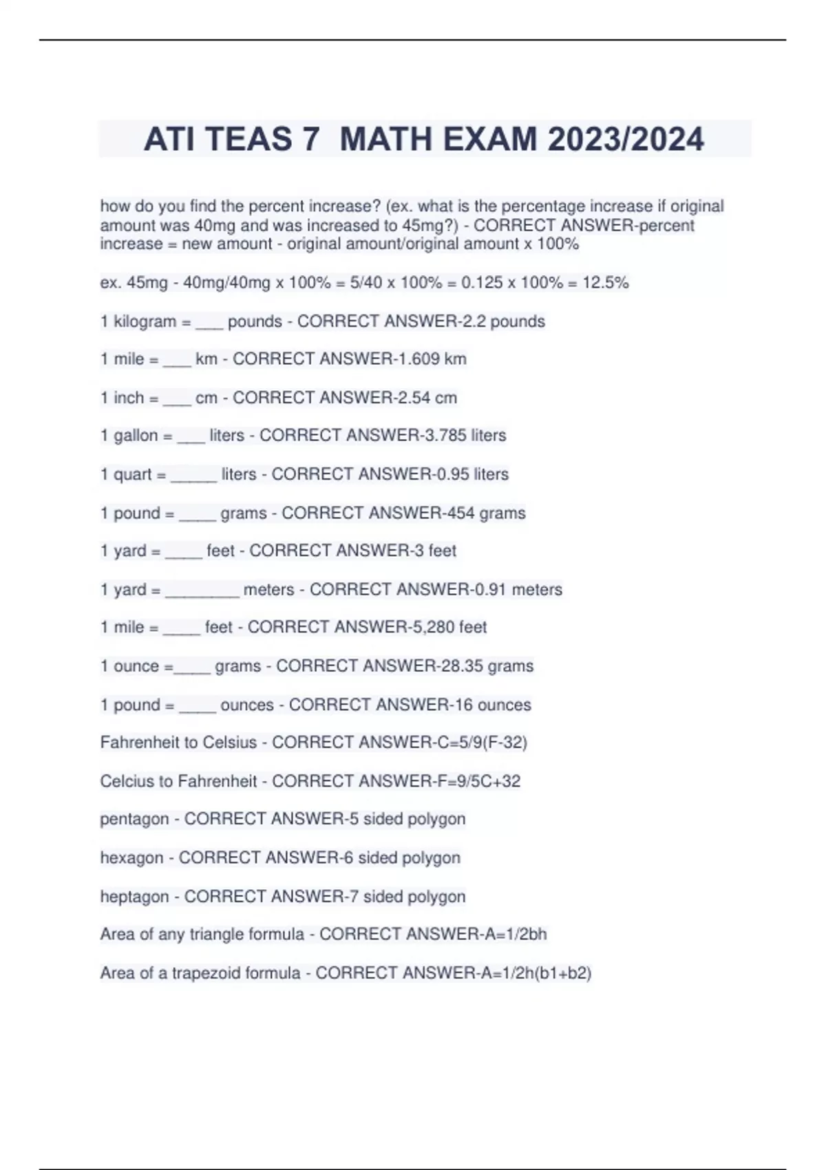 ATI TEAS 7 MATH EXAM 2023/2024 how do you find the percent increase? (ex. what is the percentage increase if original amount was 40mg and was increased to 45mg?) - CORRECT ANSWER-percent increase = new amount - original amount/original amount x 100% ex. 45mg - 40mg/40mg x 100% = 5/40 x 100% = 0.125 x 100% = 12.5% 1 kilogram = ___ pounds - CORRECT ANSWER-2.2 pounds 1 mile = ___ km - CORRECT ANSWER-1.609 km 1 inch = ___ cm - CORRECT ANSWER-2.54 cm 1 gallon = ___ liters - CORRECT ANSWER-3.785 liters 1 quart = _____ liters - CORRECT ANSWER-0.95 liters 1 pound = ____ grams - CORRECT ANSWER-454 grams 1 yard = ____ feet - CORRECT ANSWER-3 feet 1 yard = ________ meters - CORRECT ANSWER-0.91 meters 1 mile = ____ feet - CORRECT ANSWER-5,280 feet 1 ounce =____ grams - CORRECT ANSWER-28.35 grams 1 pound = ____ ounces - CORRECT ANSWER-16 ounces Fahrenheit to Celsius - CORRECT ANSWER-C=5/9(F-32) Celcius to Fahrenheit - CORRECT ANSWER-F=9/5C+32 pentagon - CORRECT ANSWER-5 sided polygon hexagon - CORRECT ANSWER-6 sided polygon heptagon - CORRECT ANSWER-7 sided polygon Area of any triangle formula - CORRECT ANSWER-A=1/2bh Area of a trapezoid formula - CORRECT ANSWER-A=1/2h(b1+b2)