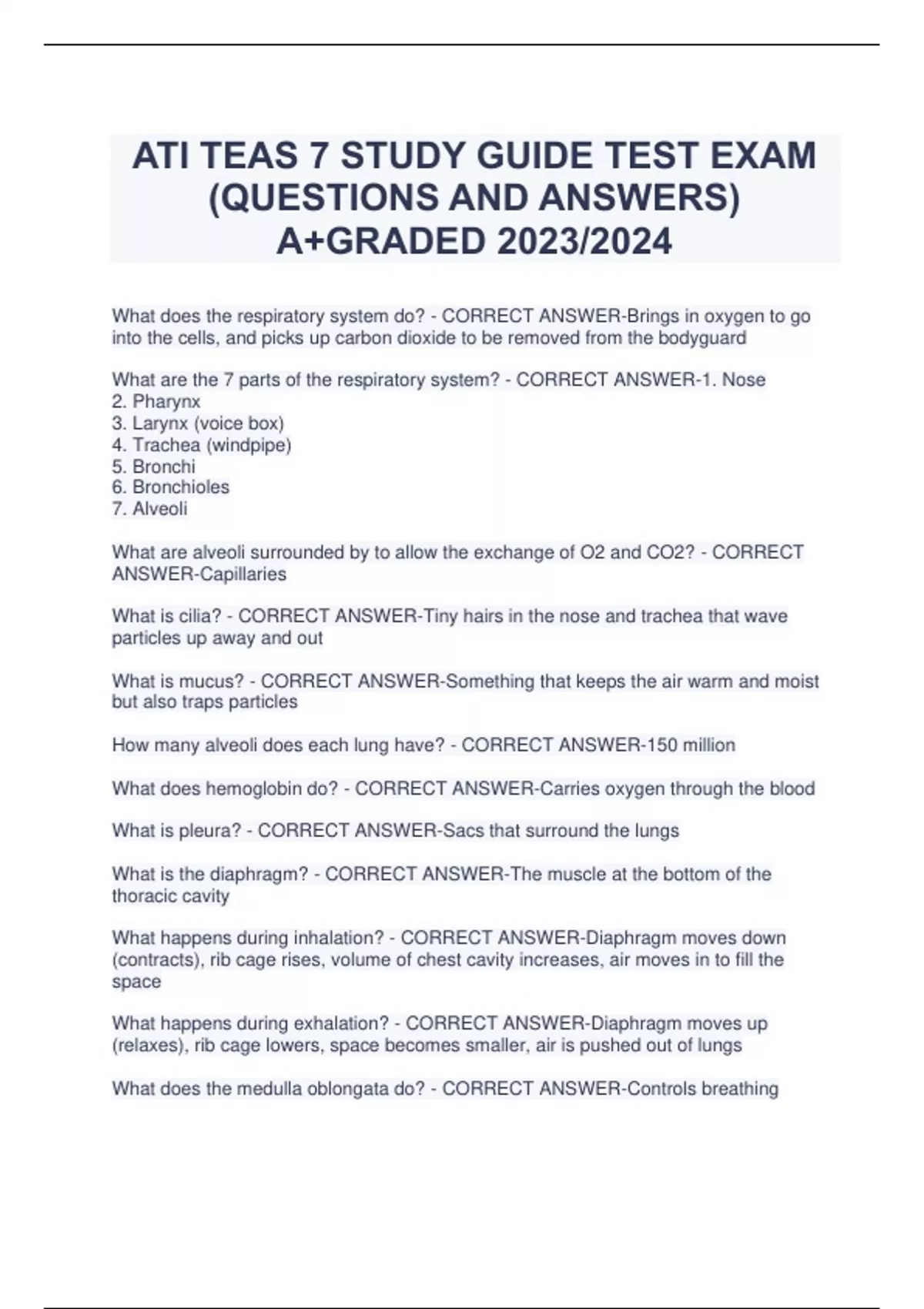 ATI TEAS 7 STUDY GUIDE TEST EXAM (QUESTIONS AND ANSWERS) A+GRADED 2023/2024 What does the respiratory system do? - CORRECT ANSWER-Brings in oxygen to go into the cells, and picks up carbon dioxide to be removed from the bodyguard What are the 7 parts of the respiratory system? - CORRECT ANSWER-1. Nose 2. Pharynx 3. Larynx (voice box) 4. Trachea (windpipe) 5. Bronchi 6. Bronchioles 7. Alveoli What are alveoli surrounded by to allow the exchange of O2 and CO2? - CORRECT ANSWER-Capillaries What is cilia? - CORRECT ANSWER-Tiny hairs in the nose and trachea that wave particles up away and out What is mucus? - CORRECT ANSWER-Something that keeps the air warm and moist but also traps particles How many alveoli does each lung have? - CORRECT ANSWER-150 million What does hemoglobin do? - CORRECT ANSWER-Carries oxygen through the blood What is pleura? - CORRECT ANSWER-Sacs that surround the lungs What is the diaphragm? - CORRECT ANSWER-The muscle at the bottom of the thoracic cavity What happens during inhalation? - CORRECT ANSWER-Diaphragm moves down (contracts), rib cage rises, volume of chest cavity increases, air moves in to fill the space What happens during exhalation? - CORRECT ANSWER-Diaphragm moves up (relaxes), rib cage lowers, space becomes smaller, air is pushed out of lungs What does the medulla oblongata do? - CORRECT ANSWER-Controls breathing What is chronic bronchitis? - CORRECT ANSWER-Bronchi swell and become clogged with mucus What is emphysema? - CORRECT ANSWER-Tissues in lungs lose elasticity; tissues can't enough O2 or get rid of enough CO2 What is lung cancer? - CORRECT ANSWER-Cells that do not stop reproducing; can spread to other locations because lungs are so central and connected to so much; survival is generally less then 5 years from diagnosis What is heart disease? - CORRECT ANSWER-Blood vessels are constricted, blood pressure rises, heart has to work harder, heart wears out more quickly What is cystic fibrosis? - CORRECT ANSWER-Genetic (recessive); lungs can get clogged with mucous What is mesothelioma? - CORRECT ANSWER-Lungs become exposed to asbestos and lose elasticity What is elastic recoil? - CORRECT ANSWER-The ability for the alveoli to get filled with air then return to their normal shape once the air is released What is a spirometer? - CORRECT ANSWER-an instrument for measuring the air capacity of the lungs What is tidal volume? - CORRECT ANSWER-The amount of air taken in and breathed out in a typical breath What is supplemental volume? - CORRECT ANSWER-The xtra air that can be inhaled or exhaled with a deep breath What is reserve amount? - CORRECT ANSWER-The amount of extra air you can breathe out when you force air out of your lungs What is residual amount? - CORRECT ANSWER-The amount of air in your lungs that you cannot get rid of (even during forced exhaling) What is vital capacity? - CORRECT ANSWER-All the air you can control going in or out of your lungs (supplemental + reserve = vital) What is total capacity? - CORRECT ANSWER-From the top of your supplemental amount to the bottom of your residual volume Main idea - CORRECT ANSWER-the most important or central thought of a paragraph or larger section of text, which tells the reader what the text is about Topic - CORRECT ANSWER-a particular issue or idea that serves as the subject of a paragraph, essay, report, or speech -topic is the general subject of a paragraph -Topics are simple and are described with just a word or a phrase. -main idea is a complete sentence; it includes the topic - CORRECT ANSWER-What's the difference between a topic and main idea? Key ideas - CORRECT ANSWER-Ideas that support controlling idea Controlling idea - CORRECT ANSWER--your opinion about the topic. - It helps the reader understand your purpose for writing the paragraph or essay Conclusion - CORRECT ANSWER-A deduction made by the reader about an unstated outcome from reading passage Inference - CORRECT ANSWER-A conclusion one can draw from the presented details. anatomical position - CORRECT ANSWER-a standard position in which the body is facing forward, the feet are parallel to each other, and the arms are at the sides with the palms facing forward Cells - CORRECT ANSWER-The basic unit of structure and function in all living things Cellular functions - CORRECT ANSWER-Processes that include growth, metabolism, replication, protein synthesis, and movement Directional terminology - CORRECT ANSWER-Words used to explain relationships of locations of anatomical elements (distal, posterior, medial, etc.) organ system - CORRECT ANSWER-A group of organs that work together in performing vital body functions. Organelle - CORRECT ANSWER-specialized structure that performs important cellular functions within a eukaryotic cell Organ - CORRECT ANSWER-A collection of tissues that carry out a specialized function of the body Reference Planes - CORRECT ANSWER-Planes dividing the body to describe locations (ex: sagittal, coronal, and transverse) Tissue - CORRECT ANSWER-A group of similar cells that perform a specific function. Eukaryotic cells - CORRECT ANSWER-Contain a nucleus and other organelles that are bound by membranes. prokaryotic cell - CORRECT ANSWER-cell that does not have a nucleus or other membrane-bound organelles. (Bacteria) Ribosome - CORRECT ANSWER-site of protein synthesis Nucleus - CORRECT ANSWER-A part of the cell containing DNA and RNA and responsible for growth and reproduction Nucleolus - CORRECT ANSWER-Found inside the nucleus and produces ribosomes Cytoplasm - CORRECT ANSWER-A jellylike fluid inside the cell in which the organelles are suspended Gogli Apparatus - CORRECT ANSWER-organelle in cells that modifies, sorts, and packages prooteins and other materials from the endoplasmic reticulum for storage in the cell or release outside the cell Vacuole - CORRECT ANSWER-A sac inside a cell that acts as a storage area Smooth Endoplasmic Reticulum - CORRECT ANSWER-creates lipids or fat Rough Endoplasmic Reticulum - CORRECT