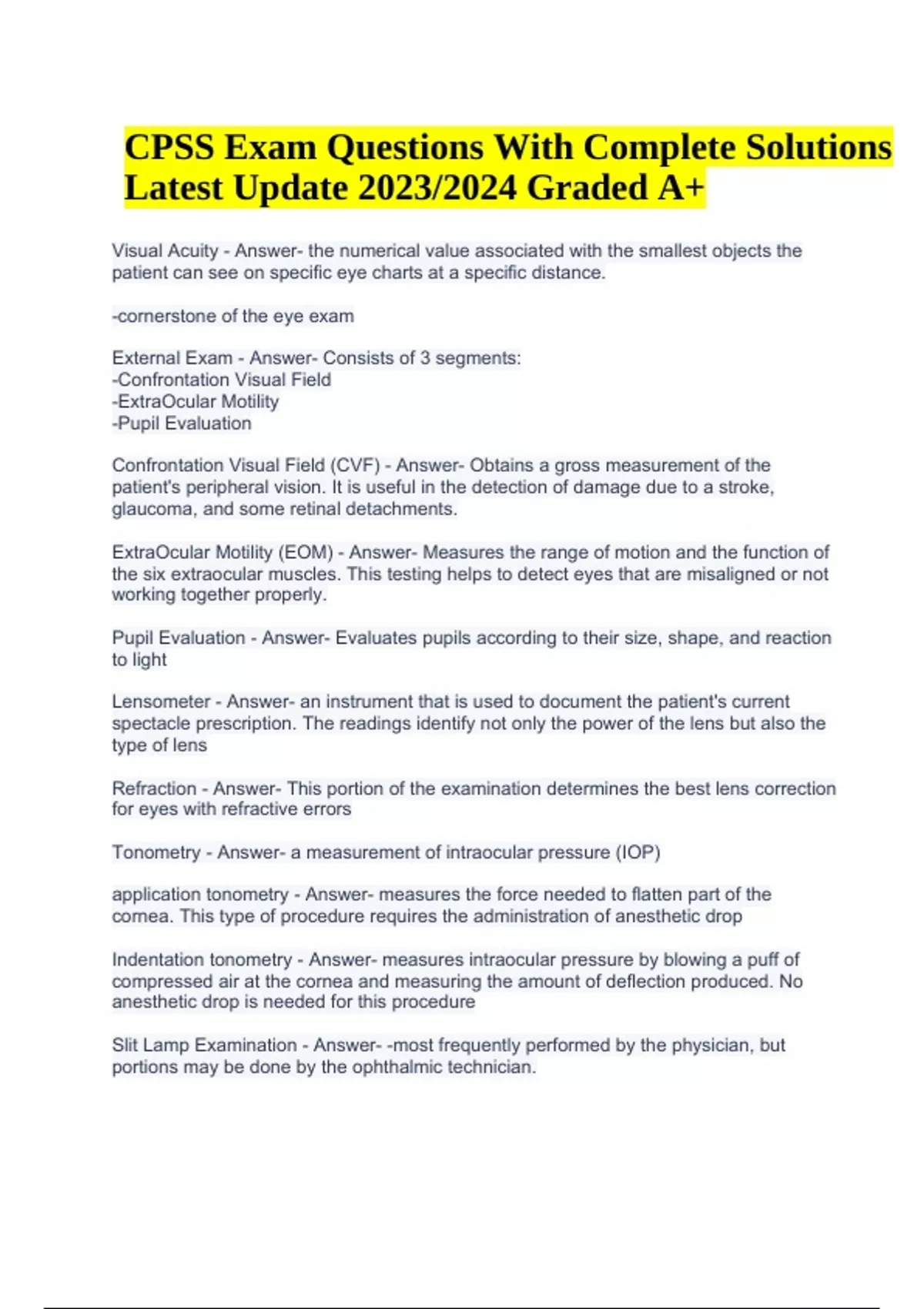 CPSS Exam Questions With Solutions Latest Update 2023/2024 | 100% Verified. Color vision - Answer- Using a book of color vision plates or pages, this test screens for acquired and/or hereditary color visual defects Corneal topography - Answer- : Using a computerized and digital instrument, this test maps the curvature of the cornea and is useful in diagnosing corneal diseases such as keratoconus and astigmatism. This testing is often performed for contact lens fittings and preliminary evaluations for refractive surgery such as LASIK. Binocularity - Answer- Tests binocularity (parallelism) and alignment of the eyes Dry Eye Test - Answer- Measures the quantity of tear secretion using a special strip of paper placed under the lower lid for a specified time (often called a Schirmer test). Extended Opthalmoscopy - Answer- Test in which the physician uses special magnification to see retinal detail. Testing includes a color drawing of the detail seen, as well as interpretation by the physician. Flurescein Angiography - Answer- A technique for viewing the detail of the blood vessels of the retina. -Fluorescein dye is injected into the patient's arm after which time-lapse photos are taken to document the appearance of the retinal blood vessels as the dye passes through. This is important in the diagnosis of retinal disorders such as diabetic retinopathy, macular edema, etc Fundus Photography - Answer- Photographs the appearance of the optic discs, the macula, and anomalies of the retina Glare Test - Brightness Acuity Testing (B.A.T) - Answer- Determines the effects of glare on visual acuity, which is often needed to document medical necessity for cataract surgery Gonioscopy - Answer- A mirrored contact lens evaluation by the physician to examine the angle structures in the front portion of eye that allow for fluid outflow (primarily a screening test for glaucoma) Keratometry - Answer- Measures the curvature of a cornea. These measurements are frequently taken on patients who are being fitted for contact lenses, measured for intraocular lenses for cataract surgery, or who may have corneal problems. The results are called "K" readings. Nerve Fiber Analyzer (HRT, GDX) - Answer- This computerized, digital instrument captures the appearance of the nerve fibers of the optic nerve. This test is useful in the diagnosis and maintenance of glaucoma. Optical Coherence Tomography - Answer- Takes transpupillary images of the retina to assist in diagnosis and treatment of retinal diseases. Pachymetry - Answer- Measures the thickness of the cornea. This is used commonly in the diagnosis of glaucoma and corneal disease. Potential Acuity Measure (PAM) - Answer- Tests a patient's potential for improvement in visual acuity following cataract surgery. Stereopsis Test - Answer- Screens for normal or abnormal depth perception in both eyes Ultrasonography (biometry) - Answer- Uses the reflection or echo of sound waves to measure the length of the eye or to detect abnormalities in the eye. Visual Field (perimetry) - Answer- Used to test and document abnormal defects in a patient's central and peripheral vision. This test is most commonly used to diagnose and monitor glaucoma and other neurological eye problems. Agre related macular degeneration (AMD) - Answer- Degeneration of the macula, resulting in loss of central and reading vision. It affects older people. Astigmatism - Answer- Irregular curvature of the cornea causing blurred vision that normally can be corrected using a cylindrical lens.