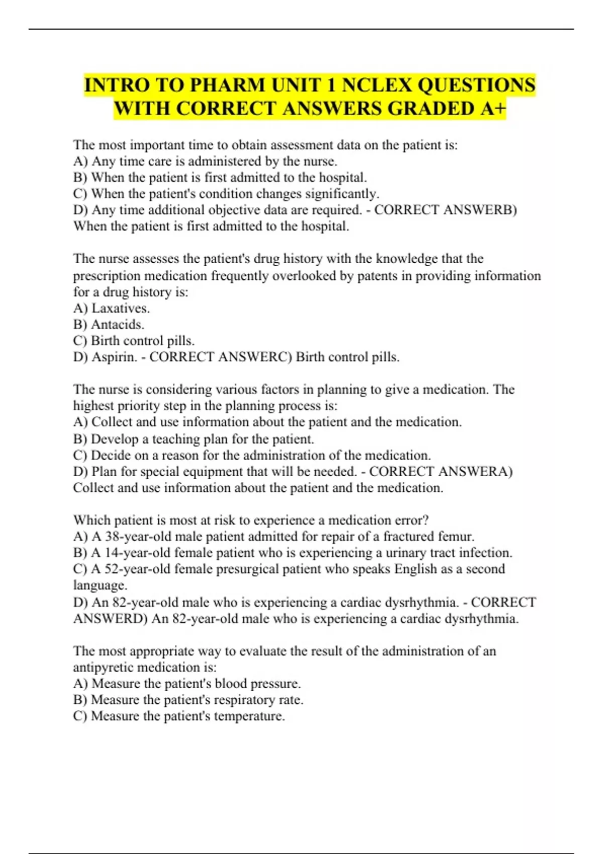 INTRO TO PHARM UNIT 1 NCLEX QUESTIONS WITH CORRECT ANSWERS GRADED A+
