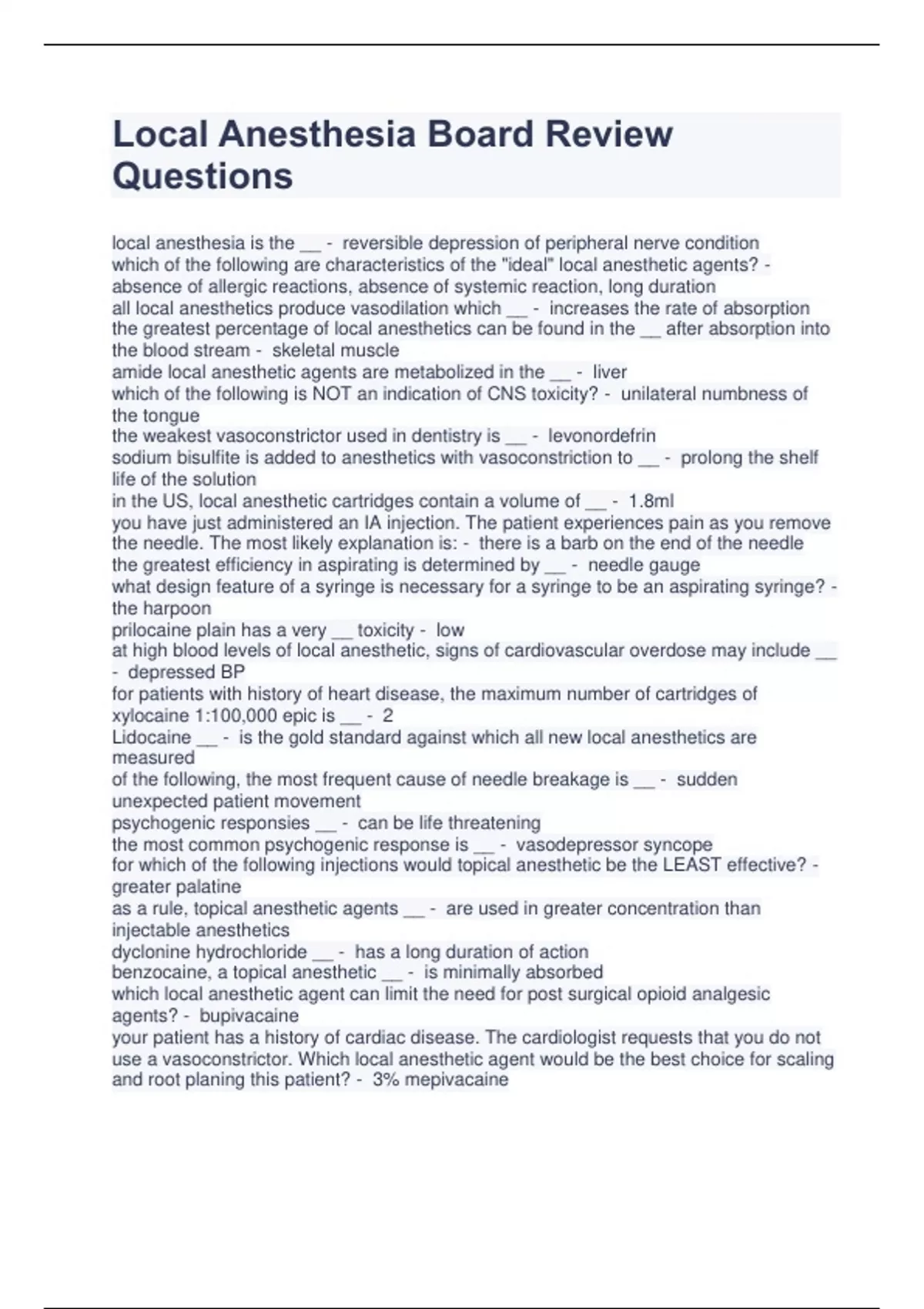 Local Anesthesia Board Review Questions local anesthesia is the __ - reversible depression of peripheral nerve condition which of the following are characteristics of the "ideal" local anesthetic agents? - absence of allergic reactions, absence of systemic reaction, long duration all local anesthetics produce vasodilation which __ - increases the rate of absorption the greatest percentage of local anesthetics can be found in the __ after absorption into the blood stream - skeletal muscle amide local anesthetic agents are metabolized in the __ - liver which of the following is NOT an indication of CNS toxicity? - unilateral numbness of the tongue the weakest vasoconstrictor used in dentistry is __ - levonordefrin sodium bisulfite is added to anesthetics with vasoconstriction to __ - prolong the shelf life of the solution in the US, local anesthetic cartridges contain a volume of __ - 1.8ml you have just administered an IA injection. The patient experiences pain as you remove the needle. The most likely explanation is: - there is a barb on the end of the needle the greatest efficiency in aspirating is determined by __ - needle gauge what design feature of a syringe is necessary for a syringe to be an aspirating syringe? - the harpoon prilocaine plain has a very __