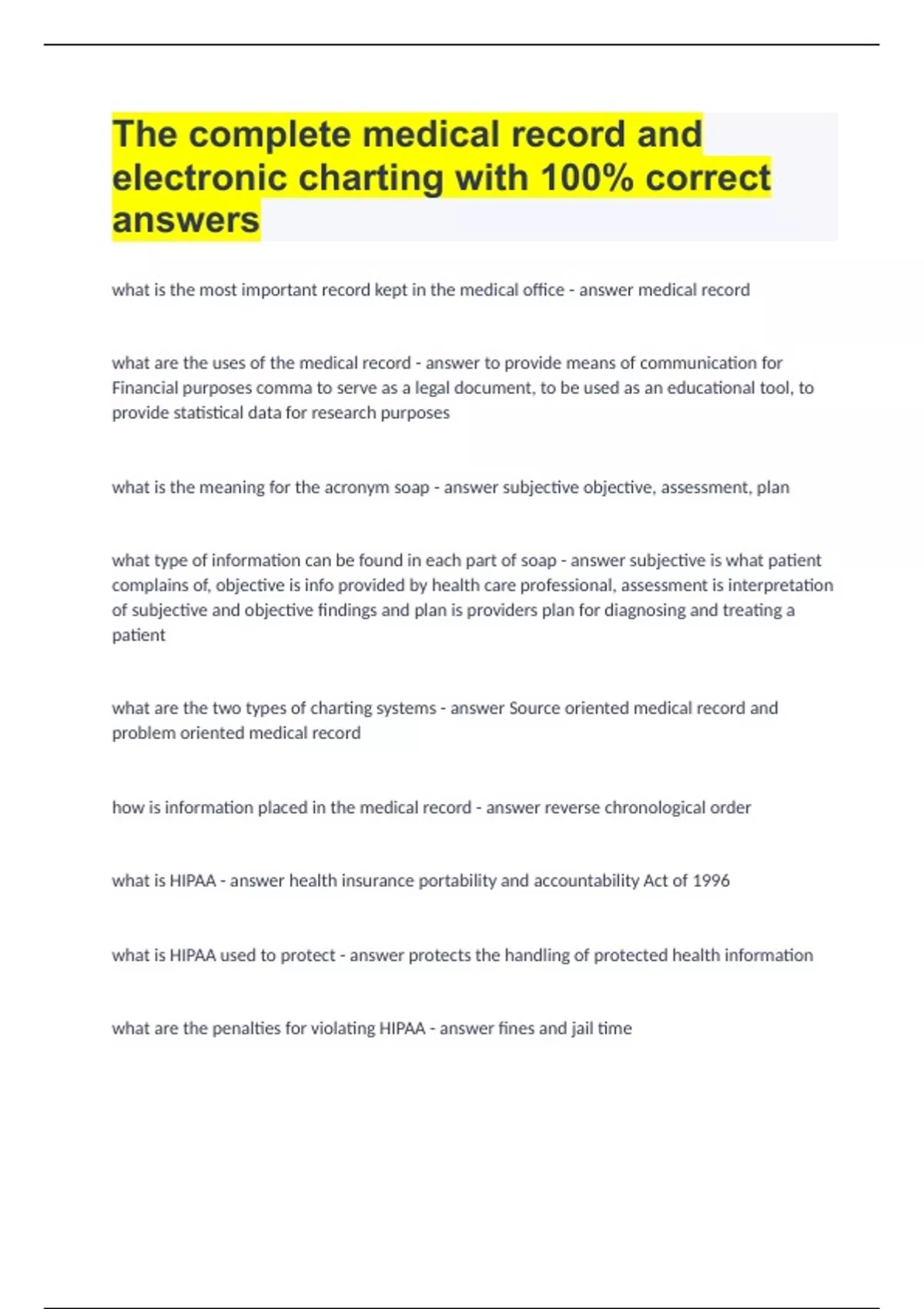 what is the most important record kept in the medical office medical record what are the uses of the medical record to provide means of communication for Financial purposes comma to serve as a legal document, to be used as an educational tool, to provide statistical data for research purposes what is the meaning for the acronym soap subjective objective, assessment, plan what type of information can be found in each part of soap subjective is what patient complains of, objective is info provided by health care professional, assessment is interpretation of subjective and objective findings and plan is providers plan for diagnosing and treating a patient what are the two types of charting systems Source oriented medical record and problem oriented medical record how is information placed in the medical record reverse chronological order what is HIPAA health insurance portability and accountability Act of 1996 what is HIPAA used to protect protects the handling of protected health information what are the penalties for violating HIPAA fines and jail time what is a flow sheet rocks found in the patient's chart for the system provider in monitoring specific repetitive information at one glance such as PT slash INR, glucose, blood pressure readings, diabetic, coumadin therapy, hypertension what is the required amount of time to keep medical records and how are they disposed of correctly 7 to 10 years for adults and 7 to 10 years after age of majority for Pediatrics medical records must be shredded what is considered the heart of the patient's medical record progress notes what type of information should be recorded within the record telephone encounters, procedures, treatments and other interactions that take place with the patient electronic medical records patient records in digital format electronic health records interoperability of electronic medical records, or ability to share medical records with other Healthcare facilities Source oriented medical record more traditional format used for recording data in the medical record period charts in which somr format is used for divided into specific sections including history and physical, progress notes, nursing medical assisting notes, laboratory and diagnostic testing problem oriented medical record contains four categories such as database, problem list, plan of action, progress notes who developed the pomr Lawrence weed who does the medical record belong to the practice or treating provider or Hospital the practice owns the physical part of the record, who owns the information stored within the chart the patient computer physician order entry application used by Healthcare Providers to enter patient care information advance directives legal documents such as a living will durable power of attorney and Health Care proxy that allow people to convey their decisions about end-of-life care ahead of time meaningful use set of Standards defined by CMS incentive programs that governs the use of ehrs and allows eligible providers and hospitals to earn incentive payments by meeting specific criteria business associate agreement document signed by all business partners to decide how Phi is to be handled commission that was the oldest and best-known of the six each are certifying agencies recognized by the onc as responsible for certifying electronic medical records CCHIT certification commission for healthcare information technology shingling method for filing live reports when reports are not the size of a standard piece of paper notice of privacy practices patient should receive a notice for how their personal medical information may be used problem list a record of specific problems that are identified from the patient history form, it should this be problems as they arise, each problem is numbered and she include the name of the problem or diagnosis minimum necessary requires that UD identify information Phi with all HIPAA identifiers are removed