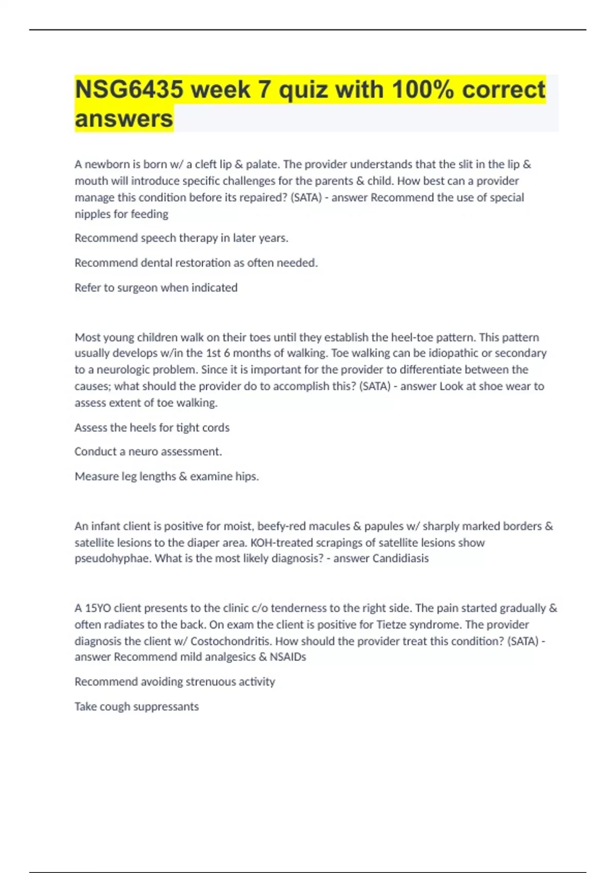 A newborn is born w/ a cleft lip & palate. The provider understands that the slit in the lip & mouth will introduce specific challenges for the parents & child. How best can a provider manage this condition before its repaired? (SATA) Recommend the use of special nipples for feeding Recommend speech therapy in later years. Recommend dental restoration as often needed. Refer to surgeon when indicated Most young children walk on their toes until they establish the heel-toe pattern. This pattern usually develops w/in the 1st 6 months of walking. Toe walking can be idiopathic or secondary to a neurologic problem. Since it is important for the provider to differentiate between the causes; what should the provider do to accomplish this? (SATA) Look at shoe wear to assess extent of toe walking. Assess the heels for tight cords Conduct a neuro assessment. Measure leg lengths & examine hips. An infant client is positive for moist, beefy-red macules & papules w/ sharply marked borders & satellite lesions to the diaper area. KOH-treated scrapings of satellite lesions show pseudohyphae. What is the most likely diagnosis? Candidiasis A 15YO client presents to the clinic c/o tenderness to the right side. The pain started gradually & often radiates to the back. On exam the client is positive for Tietze syndrome. The provider diagnosis the client w/ Costochondritis. How should the provider treat this condition? (SATA) Recommend mild analgesics & NSAIDs Recommend avoiding strenuous activity Take cough suppressants A 6YO client presents to the clinic c/o of an intermittent limp & pain to the anterior thigh. Upon exam, the following is noted: antalgic gait w/ limited hip movement, atrophy of the gluteus, quadriceps, & hamstring muscles; decreased abduction, internal rotation, & extension of the hip & pain on rolling the leg internally. What is the most likely diagnosis? Legg-Calvé-Perthes Disease A 9YO client in town for the summer presents to the clinic c/o a rash. Upon exam, the following is noted: multiple, annular, scaling & discrete hypopigmented patches located on the trunk. KOH scrapings of the lesions revealed short curved hyphae & circular spores that fluoresced yellow-orange under the Wood's lamp. What is the most likely diagnosed? Tinea versicolor A 17YO client presents to the clinic c/o of small bumps all over the face. Upon exam, the following is noted: very small, firm, flesh-colored discrete papules 1 - 6mm in size located to the face, axillae & trunk. What is the most likely diagnosis? Molluscum contagiosum A 5YO client who presents to your clinic is found to have small white oval cases attached tightly to the hair shafts at the back of the head, nape of the neck & eyelashes. What is the best TX approach? Prescribe medication that follows local resistance patterns A 4YO client reports to the clinic w/ visible scratch marks to the arms. The mother explains that the client is restless, cranky & scratches throughout the day which intensifies at night. On exam, the following is noted: S-shaped burrows in the webs of fingers, sides of hands & forearms. What is the most likely diagnosis & the most appropriate TX? Scabies; treat w/ AntiParasitics What are the key clinical signs & symptoms that are characteristic of the disease erythema multiforme? (SATA) Lesions of the oral mucosa that are shallow Lesions are fixed, symmetric, & have a typical distribution Lesions initially appear dusky, as red macules or edematous papules. Lesions evolve into target lesions w/ multiple,