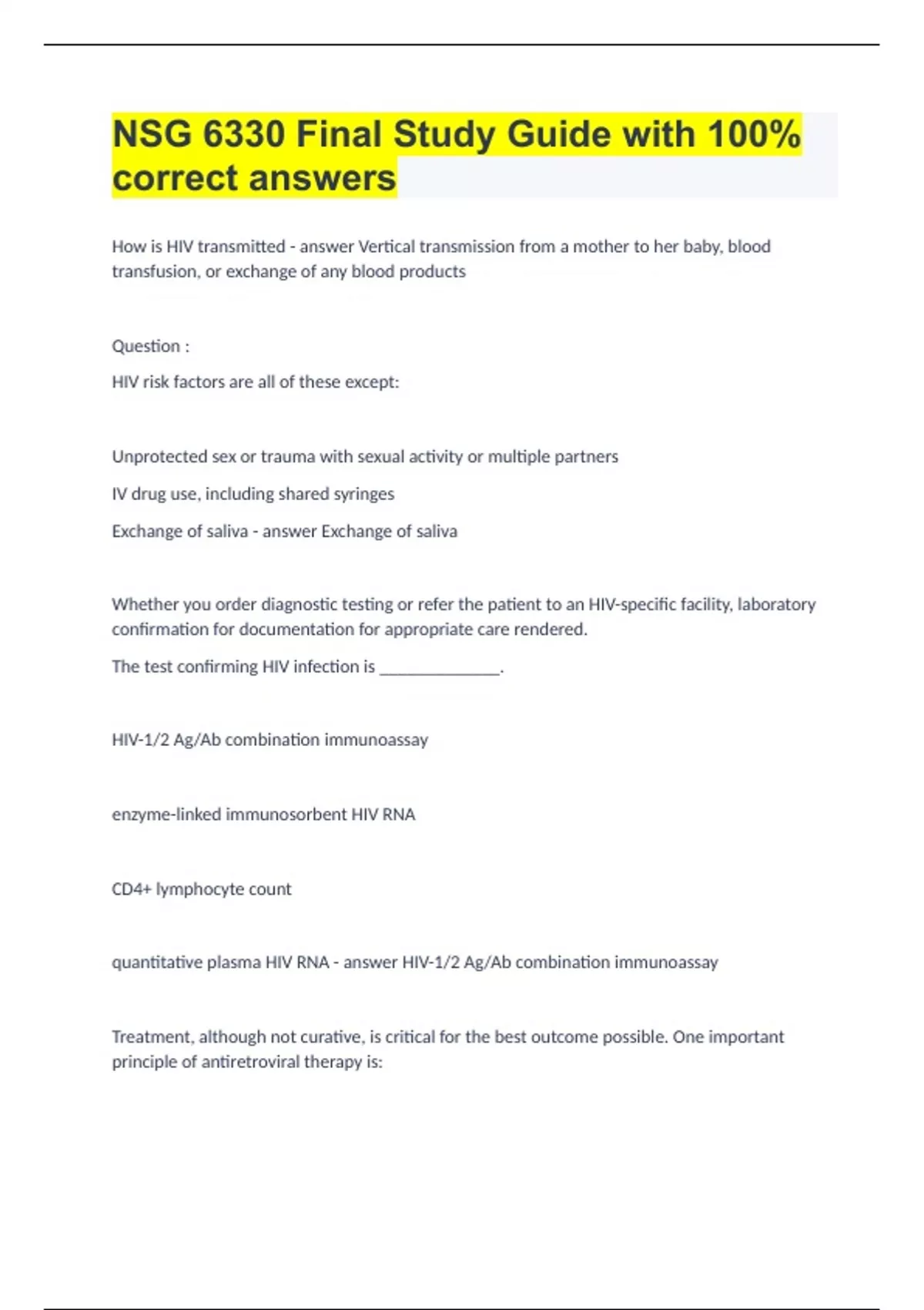 How is HIV transmitted Vertical transmission from a mother to her baby, blood transfusion, or exchange of any blood products Question : HIV risk factors are all of these except: Unprotected sex or trauma with sexual activity or multiple partners IV drug use, including shared syringes Exchange of saliva Exchange of saliva Whether you order diagnostic testing or refer the patient to an HIV-specific facility, laboratory confirmation for documentation for appropriate care rendered. The test confirming HIV infection is _____________. HIV-1/2 Ag/Ab combination immunoassay enzyme-linked immunosorbent HIV RNA CD4+ lymphocyte count quantitative plasma HIV RNA HIV-1/2 Ag/Ab combination immunoassay Treatment, although not curative, is critical for the best outcome possible. One important principle of antiretroviral therapy is: Therapy should be started when symptoms first appear. Monotherapy is recommended. Response to drug therapy is monitored by HIV RNA levels. Response to drug therapy is monitored with CD4+ counts. Response to drug therapy is monitored by HIV RNA levels. The HIV is positive, and the chest X-ray reflects bilateral infiltrates. The radiologist telephones you with a diagnosis of pneumonia. Further evaluation and report are sent to you with a diagnosis of pneumocystis pneumonia. What stage is this HIV presentation? Acute HIV infection Early-stage infection AIDS Symptomatic but likely to begin a latency period AIDS Women often tend to reschedule a well-woman visit, but they don't do so often with a problem such as pelvic pain. This symptom can present as an acute, or chronic, insult. When a woman presents with pelvic pain, the term can encompass many possibilities. Differentiating acute from chronic assists with narrowing down the possibilities but nonetheless can originate from more than one system as a referred pain or discomfort. The focus here will be of reproductive/pelvic origin. As you know, the most common cause of pelvic pain can be noted as endometriosis. But you also know that the most acute causes of pelvic pain are probably: Salpingo-oophoritis (fallopian tube/ovary) secondary to PID Gynecologic malignancy Adhesions Myomata uteri Salpingo-oophoritis (fallopian tube/ovary) A twenty-five-year-old presents with a report of a very tender area just near her introitus and to the left of her perineum. Very painful sex is how she knew "something wasn't right." She showered and when washing, she felt a "pea-sized" painful lump on the left side of her "bottom." She tells you she looked at it with a mirror and it was very small, but now it is the size of a ping-pong ball and getting worse. When you inspect her external genitalia, you are amazed at the size and appearance of the "lump." You note what appears to be an abscess on the left medial side of the labia minora, and there is some edema extending into the perineum. Your diagnosis for this presentation is: Lipoma Dermoid cyst Bartholin's cyst Skene's duct cyst Bartholin's cyst Bartholin's Cyst If a Bartholin duct gets blocked, fluid builds up in the gland. The blocked gland is called a Bartholin gland cyst You explain to this young woman what this "lump" is and let her know you will be referring her to a gynecologist you consult with regularly. You explain to her the likely treatment as follows: She will need to take sitz baths three times per day and a broad-spectrum antibiotic. This is likely a fatty tumor and will need to be surgically removed. A possible incision might be necessary and a catheter placed for two to four weeks to allow for drainage and appropriate healing. This is a folliculitis that has become infected and needs a needle aspiration and broad-spectrum antibiotic treatment. A possible incision might be necessary and a catheter placed for two to four weeks to allow for drainage and appropriate healing. You are at the office and a thirty-year-old woman presents with an abrupt onset of pain when attempting to urinate. She is also complaining of frequency and urgency and thinks she may have seen some blood as well.You take her history and she tells you she had sex three days ago with her long-term significant other, but she realized she left her diaphragm in until today when these symptoms occurred. Her BP is unremarkable, pulse is 90, temperature is 99, no costovertebral angle tenderness (CVAT), and is experiencing slight suprapubic discomfort. You review her urine dip and you note 2+ blood, +nitrates, +leukocyte esterase. You send the urine for a microscopic and culture and sensitivity but your management plan is: Pending the culture and sensitivities, you will treat accordingly. Advise her to drink cranberry juice and you will give her a pain medication. Provide broad spectrum antibiotic while waiting for culture and sensitivity lab to return for specific microbe. Refer to a urologist. Provide broad spectrum antibiotic while waiting for culture and sensitivity lab to return for specific microbe. The diagnosis of stress incontinence can be confirmed by __________. your suspected etiology the woman's symptom history to date urodynamic evaluation pelvic muscle evaluation the woman's symptom history to date Anticholinergic medications are a type of treatment for which type of incontinence? Urge incontinence Stress incontinence Vulvodynia Vestibulitis Urge incontinence Treatment for stress incontinence can include: Student Answer: Pelvic muscle exercises/kegel floor exercises Biofeedback Weight loss if obese All of the above All of the above A well-woman visit for an adolescent should include which of the following? A general health history and physical examination, including a breast examination, pelvic with Pap smear, screening tests, counseling, immunizations, risk factors, and patient concerns A general health history focusing on reproductive and sexual health concerns (menses, gynecologic, and pregnancy related) and psychosocial (family related, peer related, emotional, and physical as well as related to abuse,