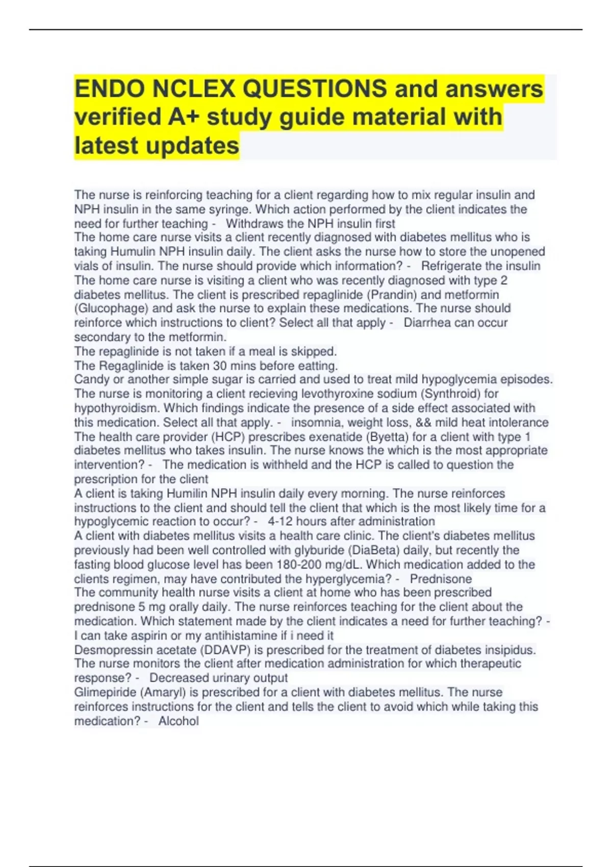 ENDO NCLEX QUESTIONS and answers verified A+ study guide material with latest updates The nurse is reinforcing teaching for a client regarding how to mix regular insulin and NPH insulin in the same syringe. Which action performed by the client indicates the need for further teaching - Withdraws the NPH insulin first The home care nurse visits a client recently diagnosed with diabetes mellitus who is taking Humulin NPH insulin daily. The client asks the nurse how to store the unopened vials of insulin. The nurse should provide which information? - Refrigerate the insulin The home care nurse is visiting a client who was recently diagnosed with type 2 diabetes mellitus. The client is prescribed repaglinide (Prandin) and metformin
