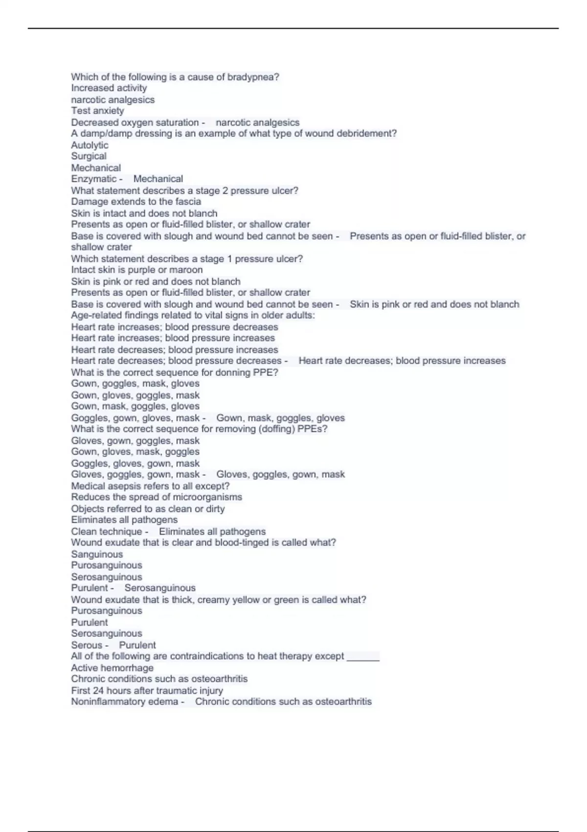 Which of the following is a cause of bradypnea? Increased activity narcotic analgesics Test anxiety Decreased oxygen saturation - narcotic analgesics A damp/damp dressing is an example of what type of wound debridement? Autolytic Surgical Mechanical Enzymatic - Mechanical What statement describes a stage 2 pressure ulcer? Damage extends to the fascia Skin is intact and does not blanch Presents as open or fluid-filled blister, or shallow crater Base is covered with slough and wound bed cannot be seen - Presents as open or fluid-filled blister, or shallow crater Which statement describes a stage 1 pressure ulcer? Intact skin is purple or maroon Skin is pink or red and does not blanch Presents as open or fluid-filled blister, or shallow crater Base is covered with slough and wound bed cannot be seen - Skin is pink or red and does not blanch Age-related findings related to vital signs in older adults: Heart rate increases; blood pressure decreases Heart rate increases; blood pressure increases Heart rate decreases; blood pressure increases Heart rate decreases; blood pressure decreases - Heart rate decreases; blood pressure increases What is the correct sequence for donning PPE? Gown, goggles, mask, gloves Gown, gloves, goggles, mask Gown, mask, goggles, gloves