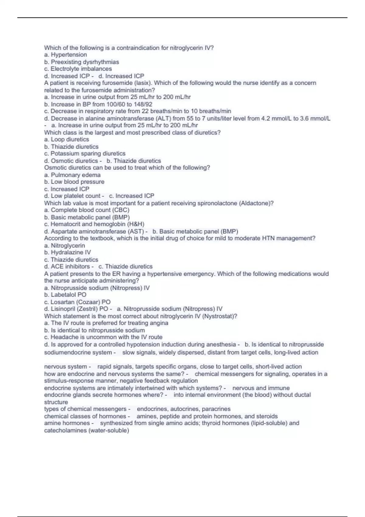 Which of the following is a contraindication for nitroglycerin IV? a. Hypertension b. Preexisting dysrhythmias c. Electrolyte imbalances d. Increased ICP - d. Increased ICP A patient is receiving furosemide (lasix). Which of the following would the nurse identify as a concern related to the furosemide administration? a. Increase in urine output from 25 mL/hr to 200 mL/hr b. Increase in BP from 100/60 to 148/92 c. Decrease in respiratory rate from 22 breaths/min to 10 breaths/min d. Decrease in alanine aminotransferase (ALT) from 55 to 7 units/liter level from 4.2 mmol/L to 3.6 mmol/L - a. Increase in urine output from 25 mL/hr to 200 mL/hr Which class is the largest and most prescribed class of diuretics? a. Loop diuretics