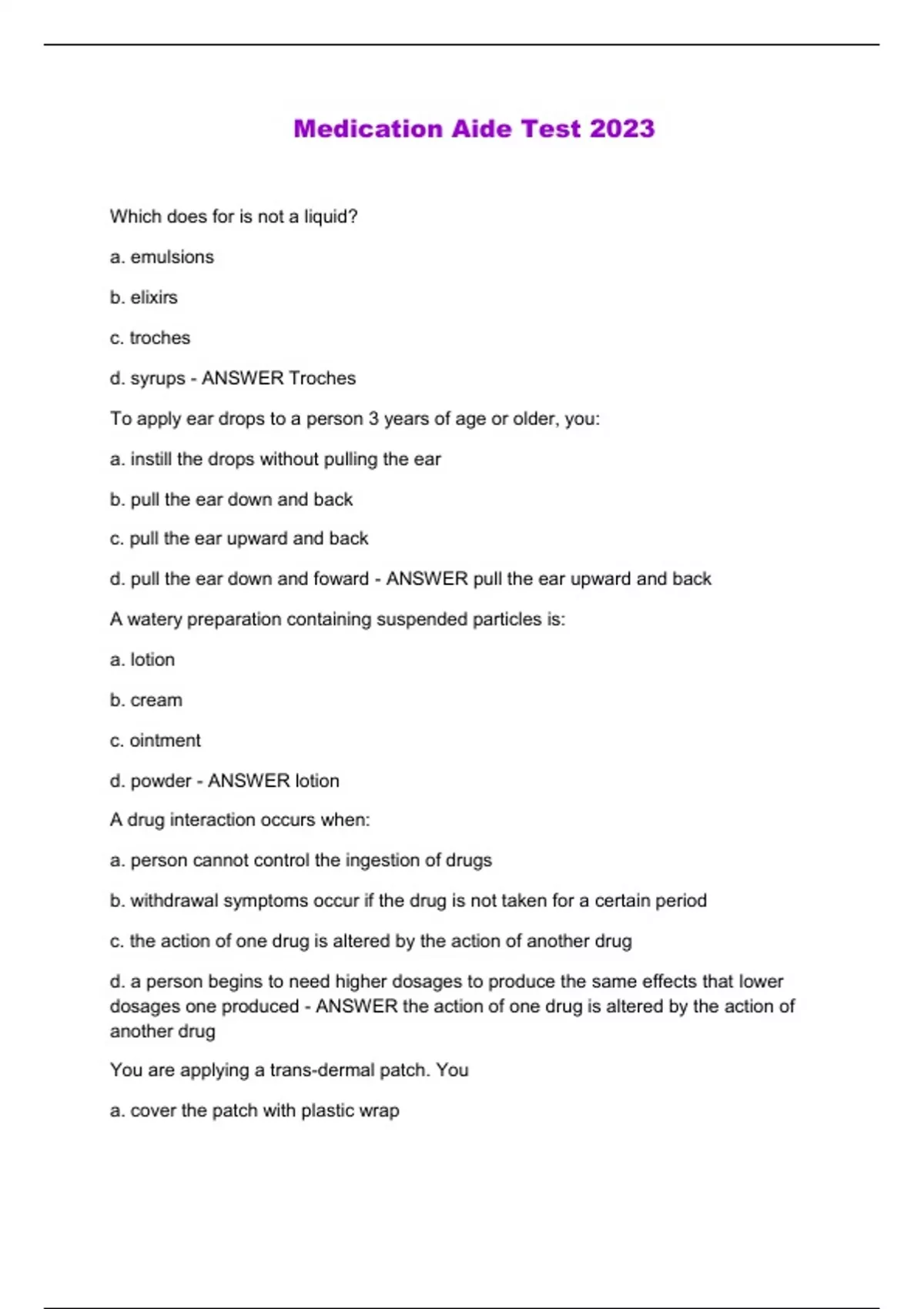 Which does for is not a liquid? a. emulsions b. elixirs c. troches d. syrups - ANSWER Troches To apply ear drops to a person 3 years of age or older, you: a. instill the drops without pulling the ear b. pull the ear down and back c. pull the ear upward and back d. pull the ear down and foward - ANSWER pull the ear upward and back A watery preparation containing suspended particles is: a. lotion b. cream c. ointment d. powder - ANSWER lotion A drug interaction occurs when: a. person cannot control the ingestion of drugs b. withdrawal symptoms occur if the drug is not taken for a certain period c. the action of one drug is altered by the action of another drug d. a person begins to need higher dosages to produce the same effects that lower dosages one produced - ANSWER the action of one drug is altered by the action of another drug