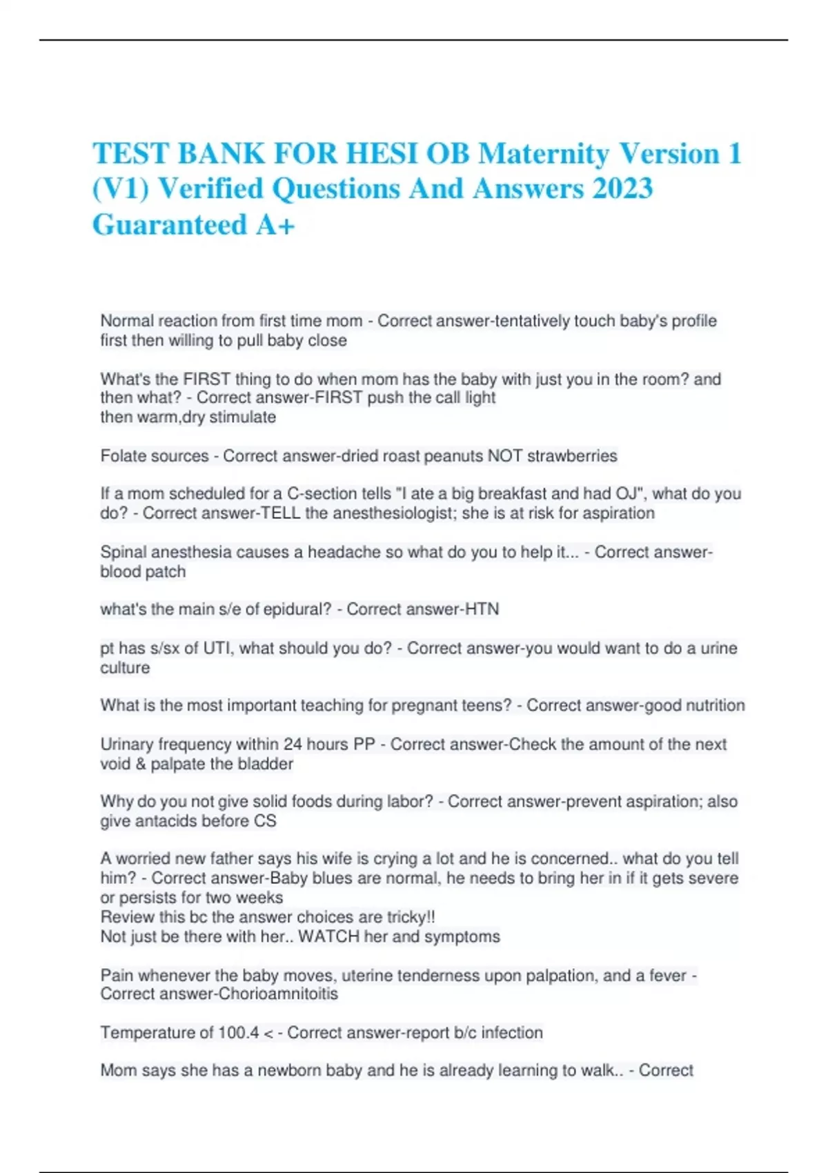 TEST BANK FOR HESI OB Maternity Version 1 (V1) Verified Questions And Answers 2023 Guaranteed A+ Normal reaction from first time mom - Correct answer-tentatively touch baby's profile first then willing to pull baby close What's the FIRST thing to do when mom has the baby with just you in the room? and then what? - Correct answer-FIRST push the call light then warm,dry stimulate Folate sources - Correct answer-dried roast peanuts NOT strawberries If a mom scheduled for a C-section tells "I ate a big breakfast and had OJ", what do you do? - Correct answer-TELL the anesthesiologist; she is at risk for aspiration Spinal anesthesia causes a headache so what do you to help it... - Correct answerblood patch what's the main s/e of epidural? - Correct answer-HTN pt has s/sx of UTI, what should you do? - Correct answer-you would want to do a urine culture What is the most important teaching for pregnant teens? - Correct answer-good nutrition Urinary frequency within 24 hours PP - Correct answer-Check the amount of the next void & palpate the bladder Why do you not give solid foods during labor? - Correct answer-prevent aspiration; also give antacids before CS A worried new father says his wife is crying a lot and he is concerned.. what do you tell him? - Correct answer-Baby blues are normal, he needs to bring her in if it gets severe or persists for two weeks Review this bc the answer choices are tricky!! Not just be there with her.. WATCH her and symptoms Pain whenever the baby moves, uterine tenderness upon palpation, and a fever - Correct answer-Chorioamnitoitis Temperature of 100.4 < - Correct answer-report b/c infection Mom says she has a newborn baby and he is already learning to walk.. - Correct answer-Stepping reflex is normal in newborn babies 3 months pregnant, thin watery secretions - Correct answer-normal lochia Herbal rememedy for nausea in pregnancy - Correct answer-Ginger NOT peppermint Caput v. cephalohematoma (know differences) - Correct answer-Caput: Crosses lines, squishy Cephalohematoma: Watch for hyperbilirubinemia, jaundice Rubella vaccine - Correct answer-- Not for pregnant women bc live attenuated virus - If you are child-bearing age and get the vaccine - make sure they are using a reliable birth control for at least a month afterwards or you have to worry about rubella congenital syndrome Best birth control for a breastfeeding mom - Correct answer-NOT the combined pill bc of the estrogen Answer: condom with spermocide gel Nothing with hormones in it NOT TRUE: she does not need birth control bc she is breastfeeding How determine estimated delivery date? - Correct answer-subtract 3 months from LMP then add seven days and change the year if needed What do you want to watch for in small infants or post mature? - Correct answer-watch hypoglycemia Small infant: don't have fat pads yet Post mature: already used up the fat pads Supine hypotension - Correct answer-- Anytime she has a hypotensive blood pressure: first thing you want to look for is putting a wedge under the hip or turning her on the stretcher Bc the baby is pushing on the vena cava - Preferred method: wedge When do you give Rhogam and why? - Correct answer-28 weeks and postpartum You give bc you want to prevent antibodies from forming against the Rh+ baby Mom was in a car accident and it is a trauma situation..what are you worried about? - Correct answer-Rh status of the mom and baby Iron supplementation - Correct answer-A/E: constipation, diarrhea, gastric irritation, n/v Nursing implications: - Best absorbed on an empty stomach and to be taken with Vit C source (OJ) to increase absorption. - Should not be taken w/ cereal, eggs or milk (decreases absorption) - Should be taken in the evening if problem exists w/ morning sickness -Stools will turn dark green to black (means they're getting the iron- if normal stools, not enough iron) - Lab values should be checked for increased reticulocytes and rising Hgb and Hct Masitits patient teaching - Correct answer-breast feeding is okay unless contraindicated b/c the abx they're on Contraction stress test is considered positive when the baby has late decelerations - Correct answer-you need to tell the HCP is happening If the uterus is firm but there is a constant trickle of blood, what could this indicate? - Correct answer-cervical laceration or superficial tear somewhere What do you need to know before getting an order for an epidural? - Correct answerwhat stage of labor she is in...you would want it to be in the active phase Risk for psychosocial distress - Correct answer-Immigrant that just moved with her husband, first baby, new country What equipment do you need to have for a cervical check? - Correct answer-Gloves, lubricant You do NOT need a specula Magnesium sulfate - Correct answer-- Calcium gluconate opposes so keep it at bedside - Floppy baby their relflexes are decreased - If you are about to give your next dose of magnesium sulfate and her RR is 7 or urine output less than 25 mL a hr, or DTRs are absent or diminshed DO NOT GIVE - It is normal for mom to have a warm flushed feeling with magnesium sulfate Magensium sulfate indication - Correct answer-- CNS depressant administered to a preeclamptic patient to prevent seizures - may be used as a tocolytic to stop preterm labor contractions Woman with gestational diabetes, she wants to fast for holiday - Correct answer-- Work with her HCP to modify her insulin regimen - Anytime there is a religious question, do whatever you can to protect their beliefs and preferences Terbutaline indication - Correct answerTerbutaline adverse reaction - Correct answer- Terbutaline nursing implications - Correct answer-• Administer IV. • Increase infusion rate every 15 minutes, depending on uterine response and maternal side effects. • Obtain maternal electrocardiogram (ECG) and lab values prior to beginning infusion. • Place mother on bedside cardiac monitor. • Monitor fetus continuously. • Monitor vital signs every 15 min