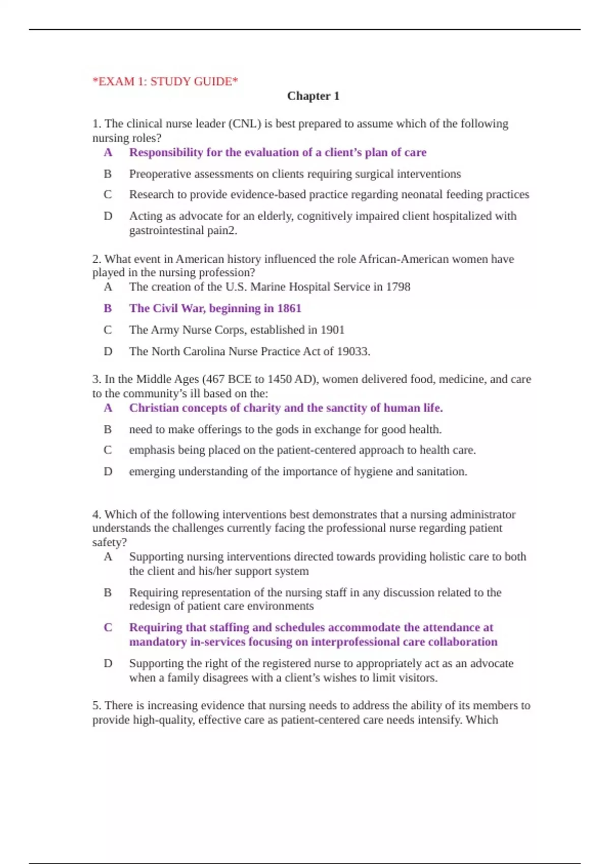 EXAM 1: STUDY GUIDE* Chapter 1 1. The clinical nurse leader (CNL) is best prepared to assume which of the following nursing roles? A Responsibility for the evaluation of a client’s plan of care B Preoperative assessments on clients requiring surgical interventions C Research to provide evidence-based practice regarding neonatal feeding practices D Acting as advocate for an elderly, cognitively impaired client hospitalized with gastrointestinal pain2. 2. What event in American history influenced the role African-American women have played in the nursing profession? A The creation of the U.S. Marine Hospital Service in 1798 B The Civil War, beginning in 1861 C The Army Nurse Corps, established in 1901 D The North Carolina Nurse Practice Act of 19033. 3. In the Middle Ages (467 BCE to 1450 AD), women delivered food, medicine, and care to the community’s ill based on the: A Christian concepts of charity and the sanctity of human life. B need to make offerings to the gods in exchange for good health. C emphasis being placed on the patient-centered approach to health care. D emerging understanding of the importance of hygiene and sanitation. 4. Which of the following interventions best demonstrates that a nursing administrator understands the challenges currently facing the professional nurse regarding patient safety? A Supporting nursing interventions directed towards providing holistic care to both the client and his/her support system B Requiring representation of the nursing staff in any discussion related to the redesign of patient care environments C Requiring that staffing and schedules accommodate the attendance at mandatory in-services focusing on interprofessional care collaboration D Supporting the right of the registered nurse to appropriately act as an advocate when a family disagrees with a client’s wishes to limit visitors.