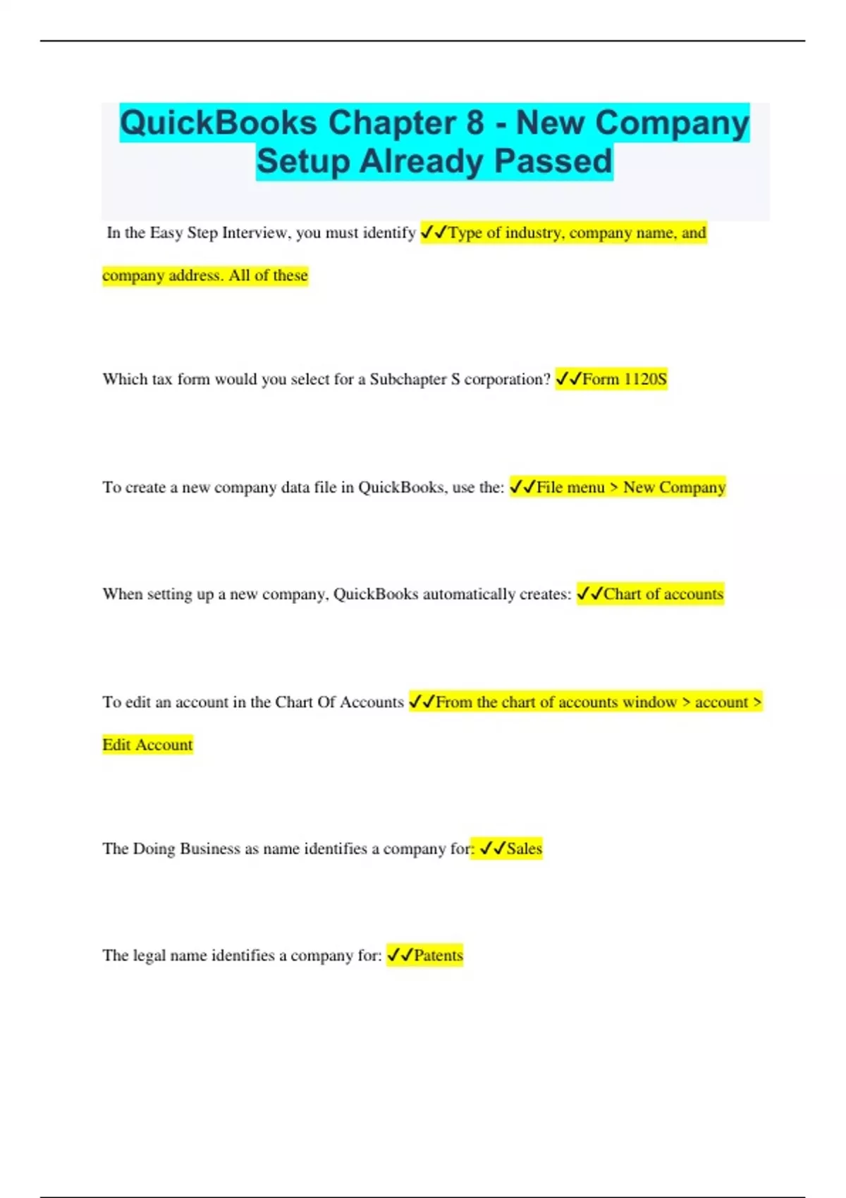 In the Easy Step Interview, you must identify Type of industry, company name, and company address. All of these Which tax form would you select for a Subchapter S corporation? Form 1120S To create a new company data file in QuickBooks, use the: File menu > New Company When setting up a new company, QuickBooks automatically creates: Chart of accounts