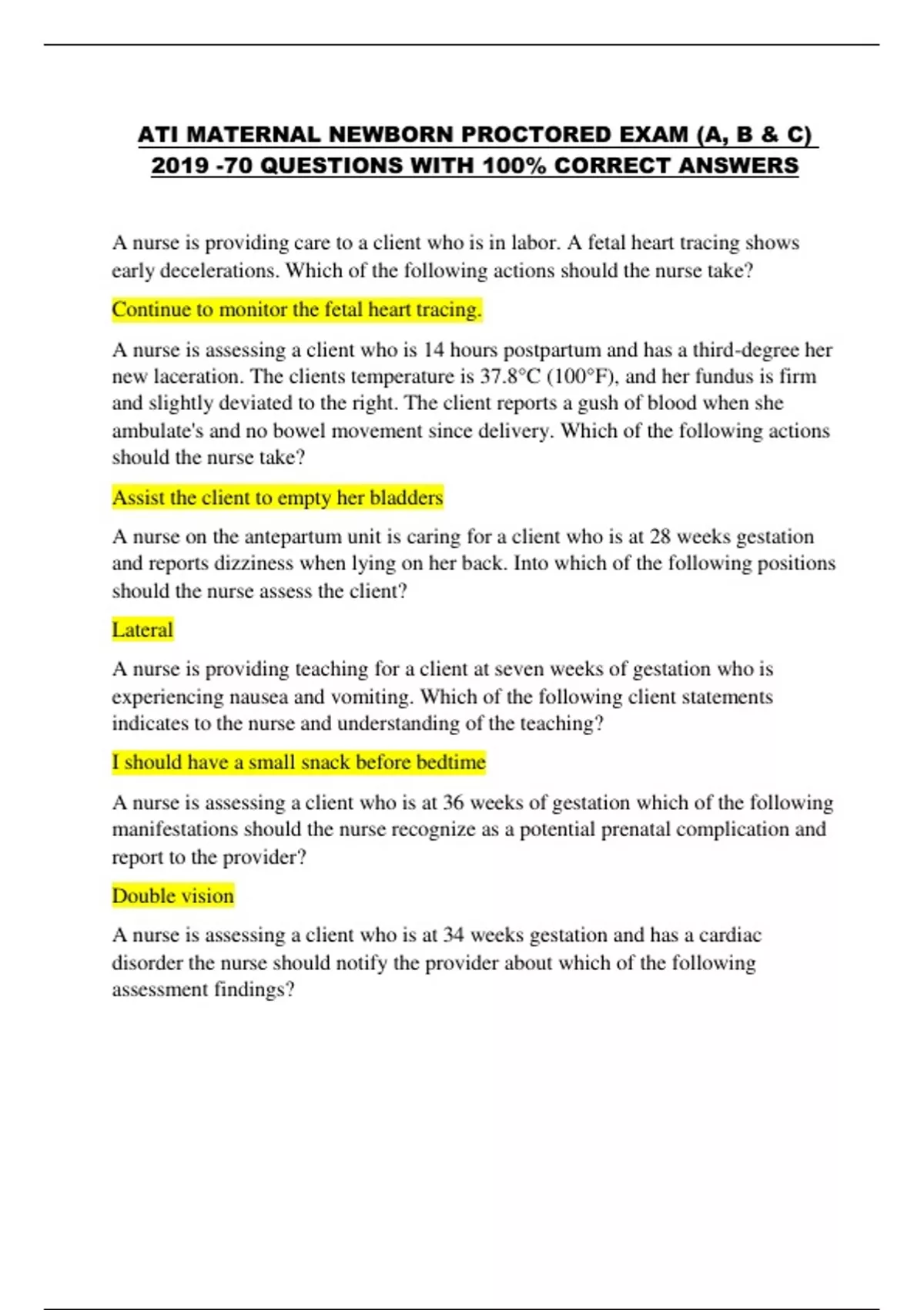 ATI MATERNAL NEWBORN PROCTORED EXAM (A, B & C) 2019 -70 QUESTIONS WITH 100% CORRECT ANSWERS