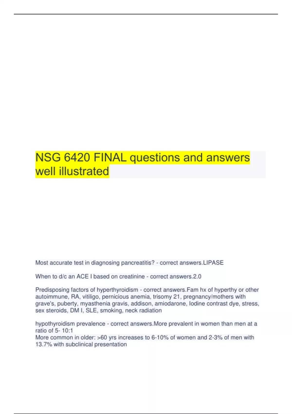 NSG 6420 FINAL questions and answers well illustrated Most accurate test in diagnosing pancreatitis? - correct answers.LIPASE When to d/c an ACE I based on creatinine - correct answers.2.0 Predisposing factors of hyperthyroidism - correct answers.Fam hx of hyperthy or other autoimmune, RA, vitiligo, pernicious anemia, trisomy 21, pregnancy/mothers with grave's, puberty, myasthenia gravis, addison, amiodarone, Iodine contrast dye, stress, sex steroids, DM I, SLE, smoking, neck radiation hypothyroidism prevalence - correct answers.More prevalent in women than men at a ratio of 5- 10:1 More common in older: 60 yrs increases to 6-10% of women and 2-3% of men with 13.7% with subclinical presentation DM diagnosis - correct answers.A1C: /6.5% FPG /126 2 hour PP glucose /200 during OGTT Random: /200 with sx DM 2 symptoms - correct ue, recurrent infections, recurrent vaginal yeast infections, prolonged wound healing, visual changes, may have classic sx of type 1 (polys) When is Niacin used? - correct answers.In combo with other meds to tx triglycerides Common sign associated with parkinsons? - correct rolling tremor First line tx for OA? - correct answers.Acetaminophen MOA of metformin? - correct answers.Pulls glucose into muscle cells to be utilized -enhances insulin sensitivity at tissues -Reduces glucose production by liver When is MRI indicated in low back pain? - correct defects Test for tenosynovitis? - correct answers.Finkelstein Tests for Carpal tunnel? - correct answers.Phalen's and Tinnel's Rotator cuff injury test - correct answers.Inability to maintain abduction Initial treatment for diagnosis of bursitis? - correct answers.Rest/avoidance of activity and NSAIDs OA risk factors? - correct answers.Older age, sex (women), obesity, joint injuries, genetics, bone deformities OGTT diagnoses what? - correct tional diabetes Lab indicative of hypothyroidism? - correct answers.TSH primary screening test: Increased TSH, dec free T4: primary Central: Dec TSH, serum T4 dec, notice impaired TSH response to TRH Tx levels above 10 or if symptomatic Normal TSH levels? - correct answers.0.40-4.2 Hypothyroidism labs? - correct answers.Increased TSH Decreased T3 T4 S/sx of grave's - correct answers.Diffuse enlargement of both thyroid lobes, with uniform uptake of isotope and elevated radioactive iodine uptake -weight loss/inc appetite Fatigue/weakness, tremors, heat intolerance, nervousness/anxiety, heart palps, consipation/diarrhea, swelling, inc sweating, diplopia, fine hair, moist smooth skin, hyperactivity, nightmares RAI in hyperthyroid tx - correct e dose to 2 doses of 75-200 mCi/g capsule orally to render hypothyroid **Tx of choice for Grave's dx -Euthyroid in 2-6 months **NOT IN children or pregnancy Lantus- type of insulin and peak - correct answers.Long-acting -Peak: no pronounced peak -onset 1-2 hours duration 24+ hours CKD risk factors - correct answers.DM, HTN, Heart dx, smoking, obesity, high cholesterol, AA/NA/Asian-am, fam hx, 65yrs Gold standard for diagnosis of CKD? - correct answers. MVP heart sound - correct mid systolic click Rovsing sign - correct answers.RLQ pain with palpation of the LLQ- suggests peritoneal irritation in the RLQ precipitated by palpation at a remote location Obturator sign - correct answers.RLQ pain with internal and external rotation of flexed right hip- suggests inflamed appendix is located deep in the right hemipelvis Psoas sign - correct answers.RLQ pain with extension of right hip or with flexion of right hip against resistance- inflamed appendix located along course of right psoas muscle -(lifting extended right leg against resistance) Murphy sign - correct answers.Increased tenderness with inspiration in RUQ- gallbladder Tenderness at McBurney's point - correct dicitis Negative HbsAg Positive HbsAb Negative HbcAB - correct ative of immunization Synthroid dosage - correct answers.Kg x 1.6 Hypothyroid prevalence in countries - correct lence in US is low compared to rest of world 0.3% d/t iodine consumption S/sx hypothyroidism - correct ssion, forgetfulness, los of hair, weight gain, dry skin, infertility, brady, goiter, brittle nails, cold skin, constipation, fullness in throat (hashimoto), jaundice, and distention, muscle aches Hypothyroidism physical findings - correct ased mentation, swelling hands and feet (non pitting), periorbital puffiness, coarsening of voice, brady, inc DBP, reduced SBP, delayed relaxation of DTR (achilles) Most common etiology of cervicitis? - correct answers.Infection: STDs -Chlamydia. trachomatis (number 1)and N.Gonorrhoeae Choice of antibiotics for cervicitis? - correct answers.Azithromycin and doxy DOC for tx of trich - correct nidazole or tinidazole Tx of choice for epididymitis - correct iaxone plus doxycycline Skin lesion fluoresces under a wood's lamp- what microscopic finding is consistent with this? - correct answers.Spores Conditions associated with atopic dermatitis? - correct allergy, asthma, allergic rhinitis "atopic march" Positive WB and ELISA with a tick bite and erythema migrans- how to treat - correct answers.Lyme disease - 14-21 days tx -Doxy, amoxicillin Elderly and appendicitis? - correct nt late with atypical symptoms -Half of pts are afebrile half demonstrate no rebound or involuntary guarding 1/4 have no RLQ tenderness Med of choice for scabies? - correct thrin 5% lotion H.pylori treatment - correct answers.Triple: clarith + amox + PPI clarith + flagyl + PPI levo + amox + PPI QUAD: Pepto + flagyl + tetracycline + PPI Hyperlipidemia treatment and LFTs-- which med doesn't monitor - correct answers.Bile Acid sequestran Anterior drawer test? - correct integrity of ACL Red flags associated with a migraine? - correct or worst HA of life, change in frequency/severity, new progressive HA persisting for days, precipitation of HA with valsalva, presence of neuro sx, onset after 55, persistent one sided, stiff neck/fever Indications for migraine prophy? - correct answers.*Suffers from frequent high-impact migraine att