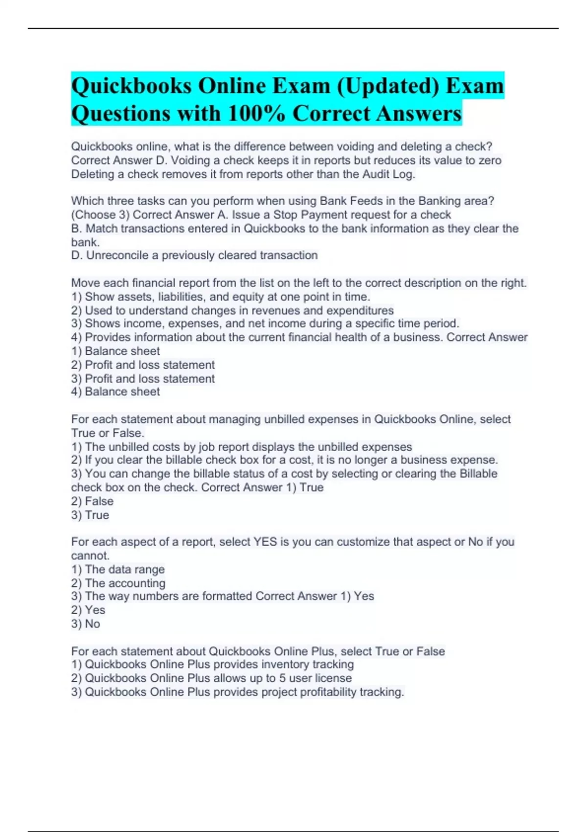 Quickbooks online, what is the difference between voiding and deleting a check? Correct Answer D. Voiding a check keeps it in reports but reduces its value to zero Deleting a check removes it from reports other than the Audit Log. Which three tasks can you perform when using Bank Feeds in the Banking area? (Choose 3) Correct Answer A. Issue a Stop Payment request for a check B. Match transactions entered in Quickbooks to the bank information as they clear the bank. D. Unreconcile a previously cleared transaction Move each financial report from the list on the left to the correct description on the right. 1) Show assets, liabilities, and equity at one point in time. 2) Used to understand changes in revenues and expenditures 3) Shows income, expenses, and net income during a specific time period. 4) Provides information about the current financial health of a business. Correct Answer 1) Balance sheet 2) Profit and loss statement 3) Profit and loss statement 4) Balance sheet For each statement about managing unbilled expenses in Quickbooks Online, select True or False. 1) The unbilled costs by job report displays the unbilled expenses 2) If you clear the billable check box for a cost, it is no longer a business expense. 3) You can change the billable status of a cost by selecting or clearing the Billable check box on the check. Correct Answer 1) True 2) False 3) True For each aspect of a report, select YES is you can customize that aspect or No if you cannot. 1) The data range 2) The accounting 3) The way numbers are formatted Correct Answer 1) Yes 2) Yes 3) No For each statement about Quickbooks Online Plus, select True or False 1) Quickbooks Online Plus provides inventory tracking 2) Quickbooks Online Plus allows up to 5 user license 3) Quickbooks Online Plus provides project profitability tracking.