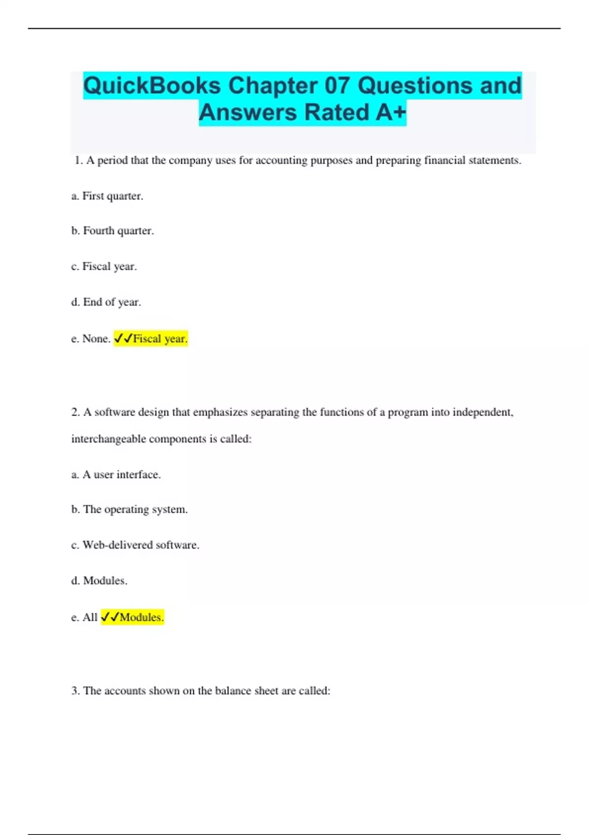 1. A period that the company uses for accounting purposes and preparing financial statements. a. First quarter. b. Fourth quarter. c. Fiscal year. d. End of year. e. None. Fiscal year. 2. A software design that emphasizes separating the functions of a program into independent, interchangeable components is called: a. A user interface. b. The operating system. c. Web-delivered software. d. Modules. e. All Modules. 3. The accounts shown on the balance sheet are called: a. Permanent accounts. b. Temporary accounts. c. Transaction entries. d. Customized accounts. e. All. Permanent accounts.